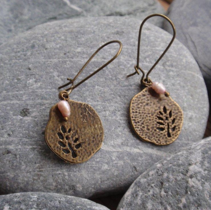 Tree Earrings in a bronze metal style disc with tree design with a little freshwater pearl.