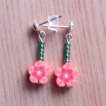 These bright earrings feature funky fimo flower beads. They are hung on silver plated headpins, with teeny green lustre glass seed beads and finished off with silver plated studs with plastic bullet backs for comfort. Really kitsch and fun to wear.