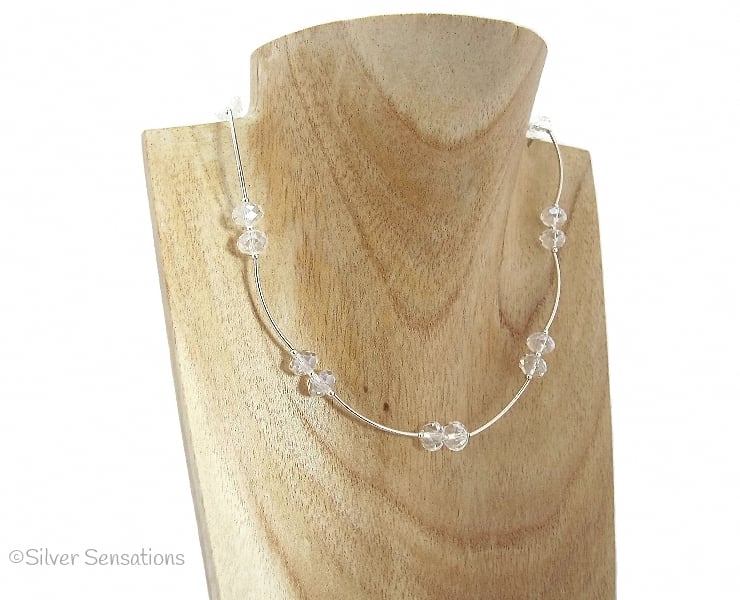 This hand crafted designer necklace is made using matching faceted Rock Crystal rondelle shaped beads which are 10mm x 7mm in size, with Sterling Silver beads & curved tubes in between.