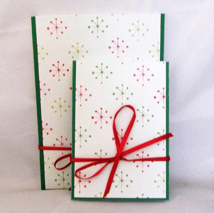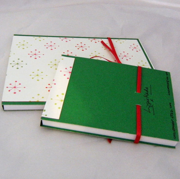 I have used bright green cardstock to enhance this paper. The notebooks in this set have card covers, which fold over the top, like a police notebook. A panel of the decorative stars paper is on the front cover, wrapping over onto the back. Each book ties at the front with a wrap-round red satin ribbon.