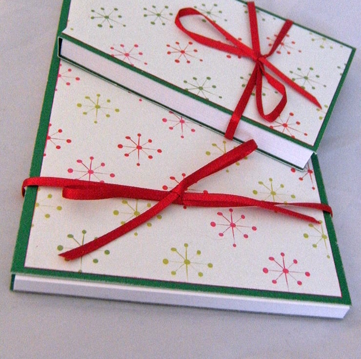 The paper panels on these covered notebooks have a sweet design of pointed stars, in red and green. The paper has a white background and the stars stand out beautifully.