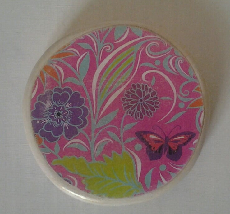 This sweet little mirror has be made using crafting clay with a heart shape mirror in the middle. Decorated with decorative floral paper and then sanded and varnished to give a slight shabby chic look.