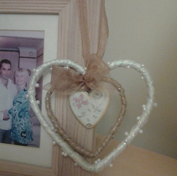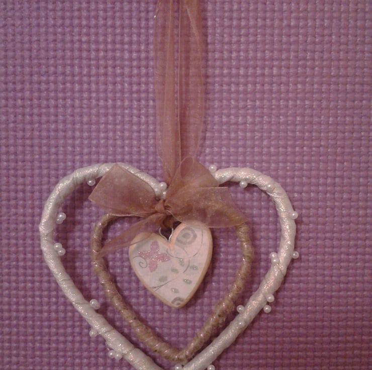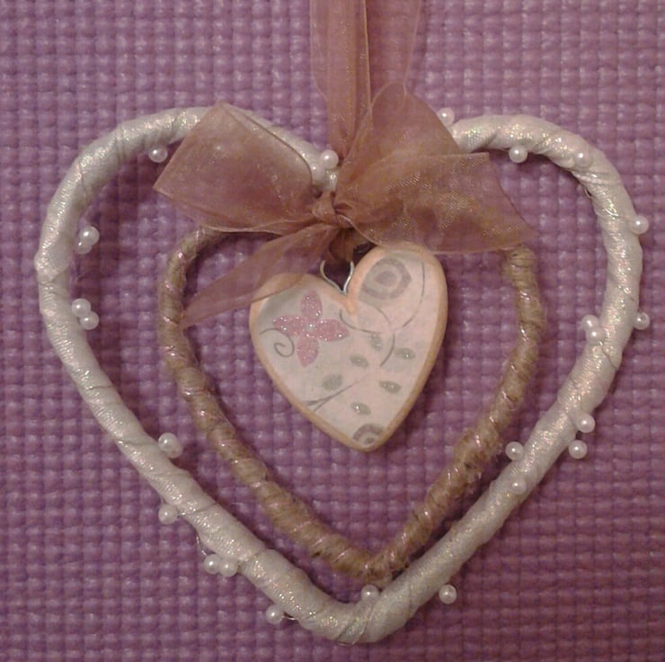 Three gorgeous hearts one inside another, The centre heart is made of balsa wood and decorated with decorative paper, the two outer hearts are made of thick wire and covered one with string and one with sparkling ribbon & wired threaded beads.
