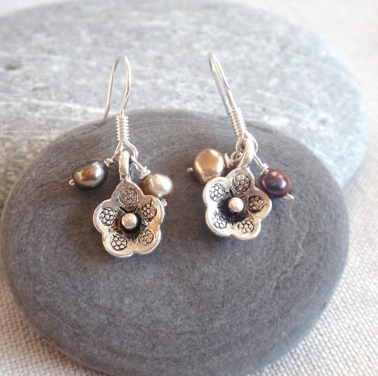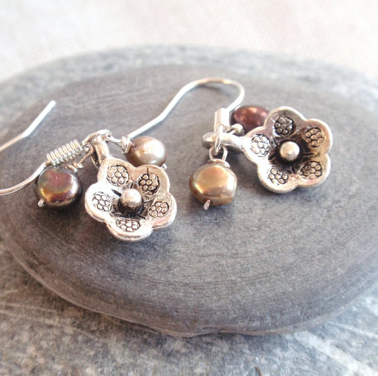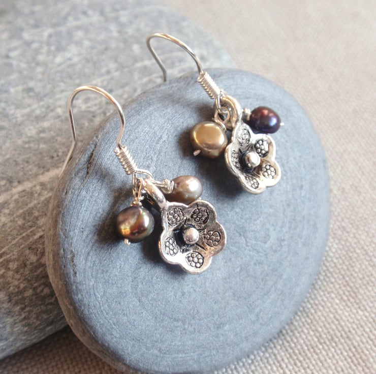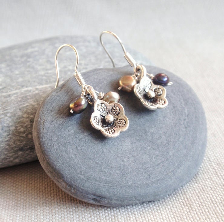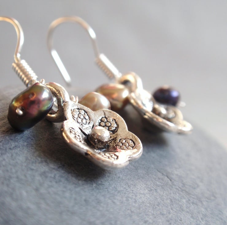 Silver tone metal flower dangle earrings with two dark, hand-wired freshwater pearls. The flower is oxidized so slightly blackened, giving it an edgy look. Silver plated hook. Drop length 1.2cm. There is another pair of flower and pearl earrings in my shop similar to this.