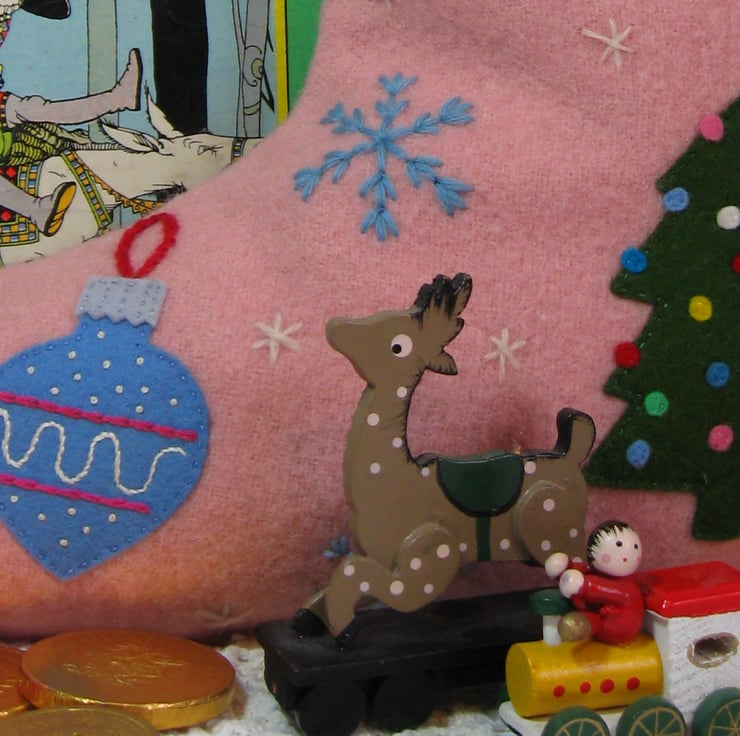 Inspired by Christmas Stockings from bygone days I've made these traditional looking stockings ideally to be filled with hand-made gifts and chocolate coins, presents we remember from our childhood.