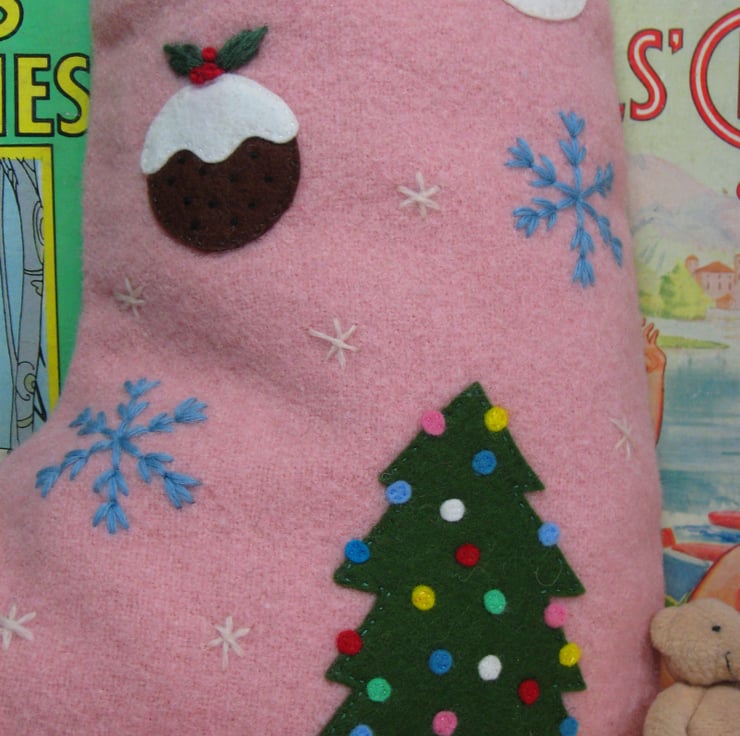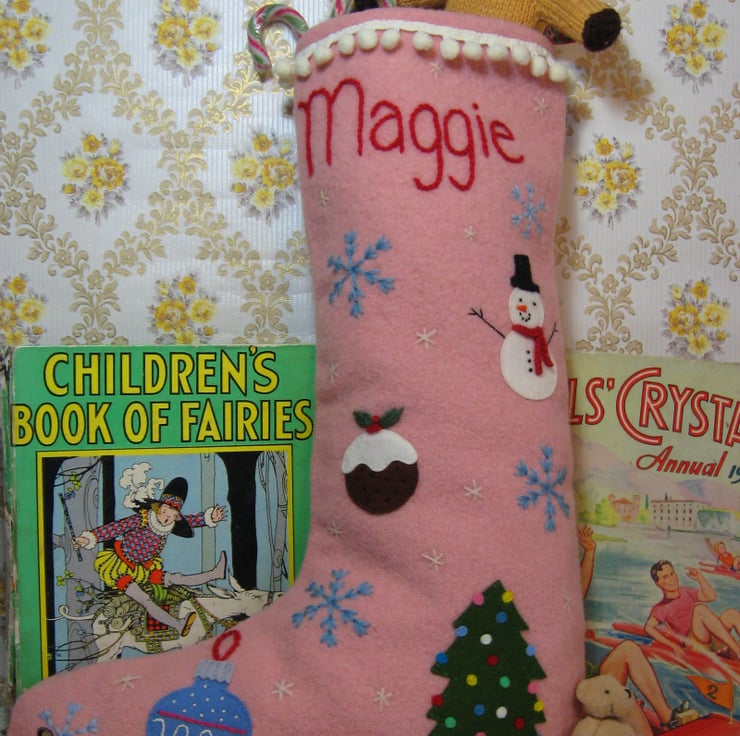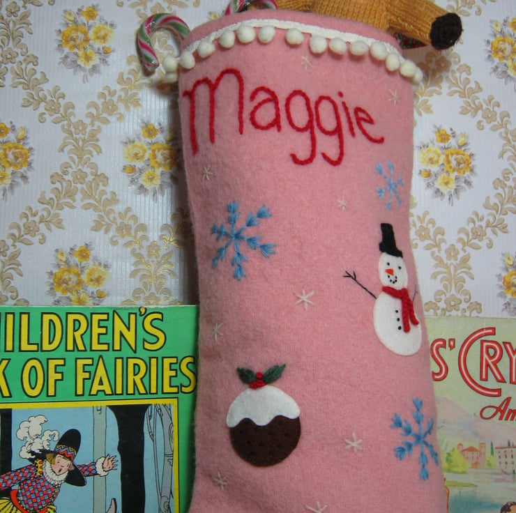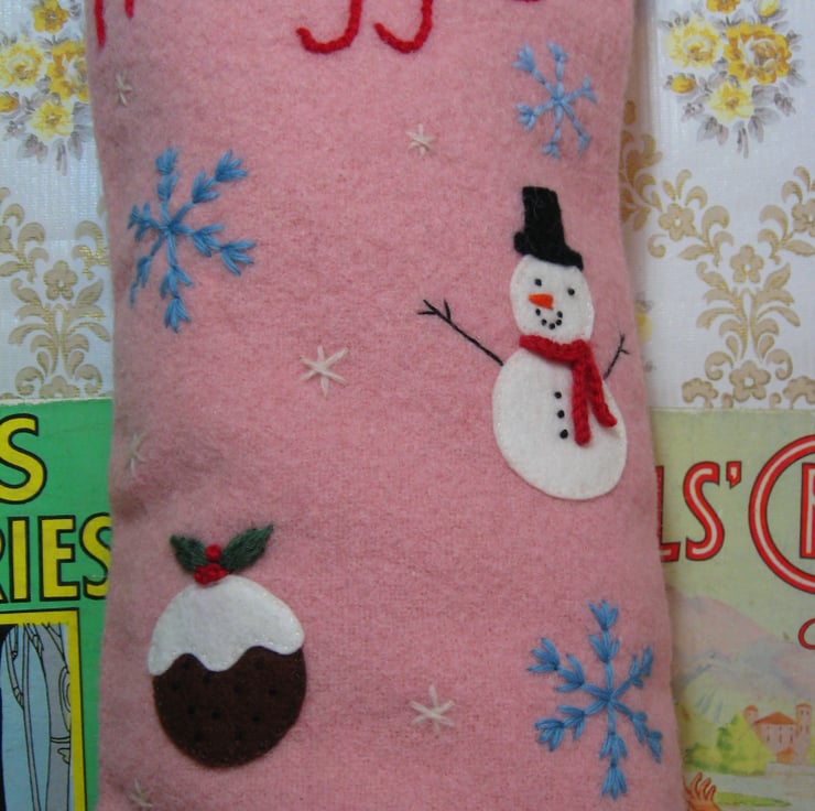 Made from vintage wool blankets, this custom made large sized stocking is hand embroidered with your choice of name, some snowflakes and an assortment of seasonal motifs made from 100% pure wool felt. . Embroidery and applique is on one side of stocking only.