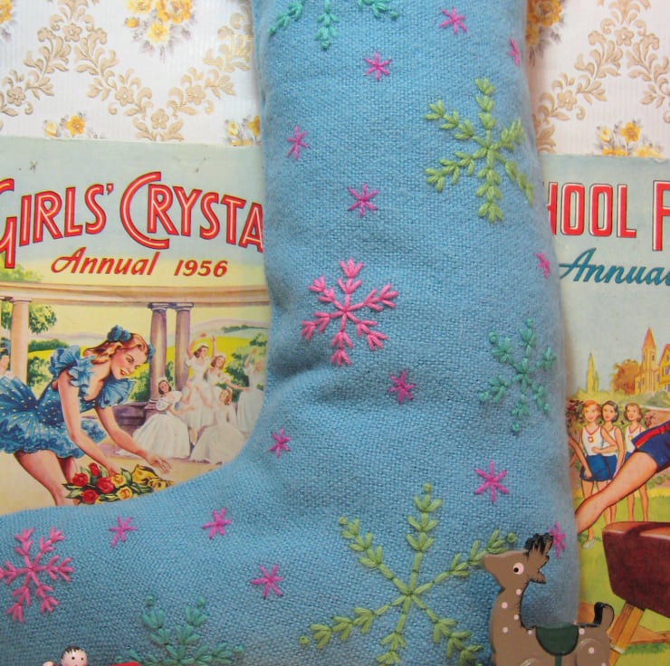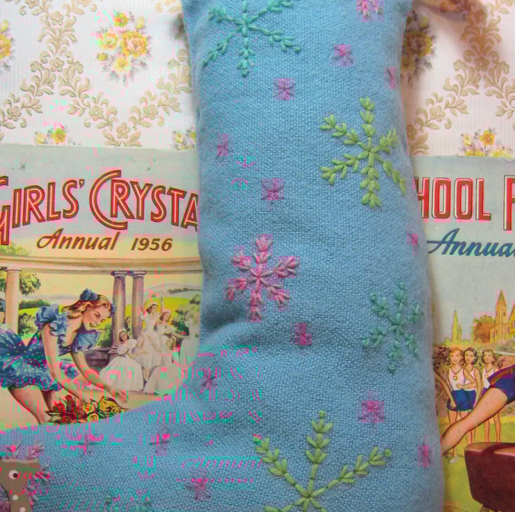 Made from a vintage blue wool blanket, this medium sized stocking has been hand embroidered with snowflakes using tapestry wool. Embroidery is on one side of stocking only.