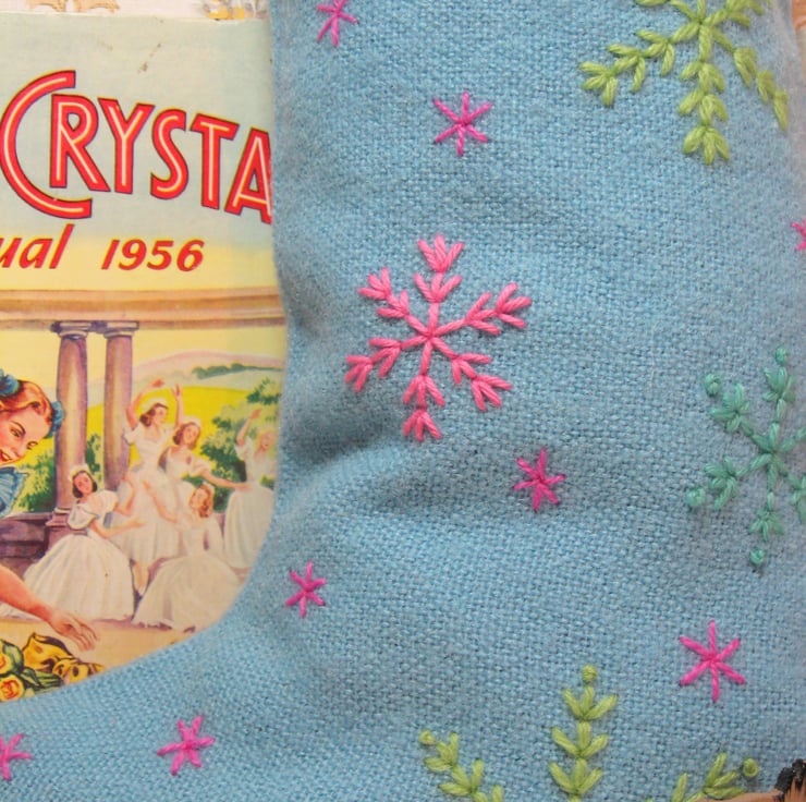 Snowflakes are embroidered in bright pink,apple green and teal vintage tapestry yarn.