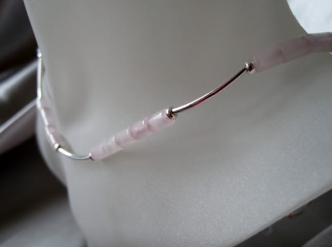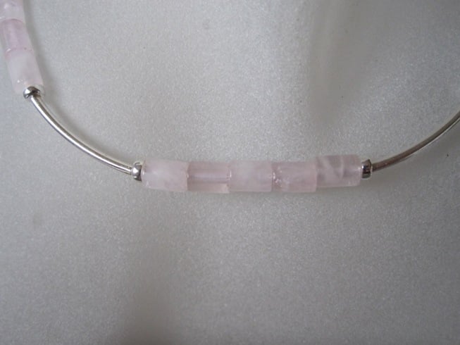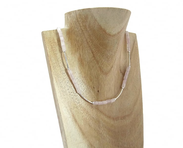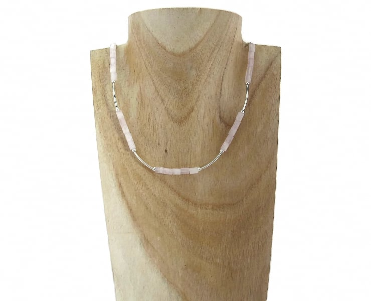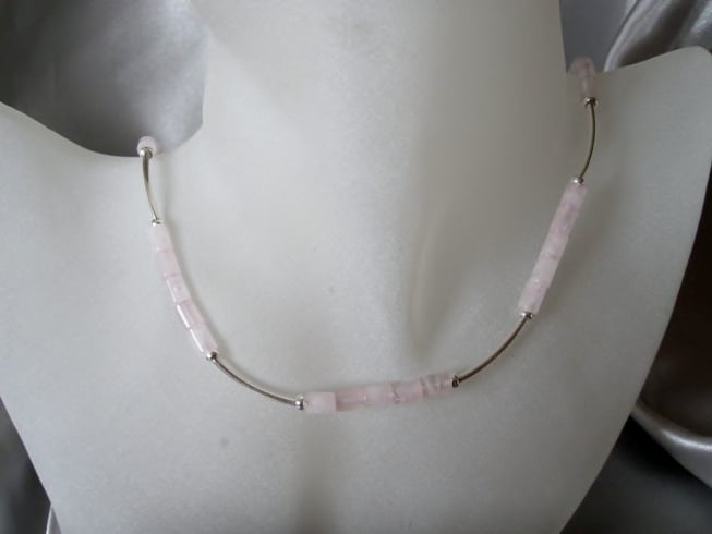 This designer hand made necklace features desirable deeper Pink Rose Quartz small tubes with curved Sterling Silver curved tubes & donut shaped beads.