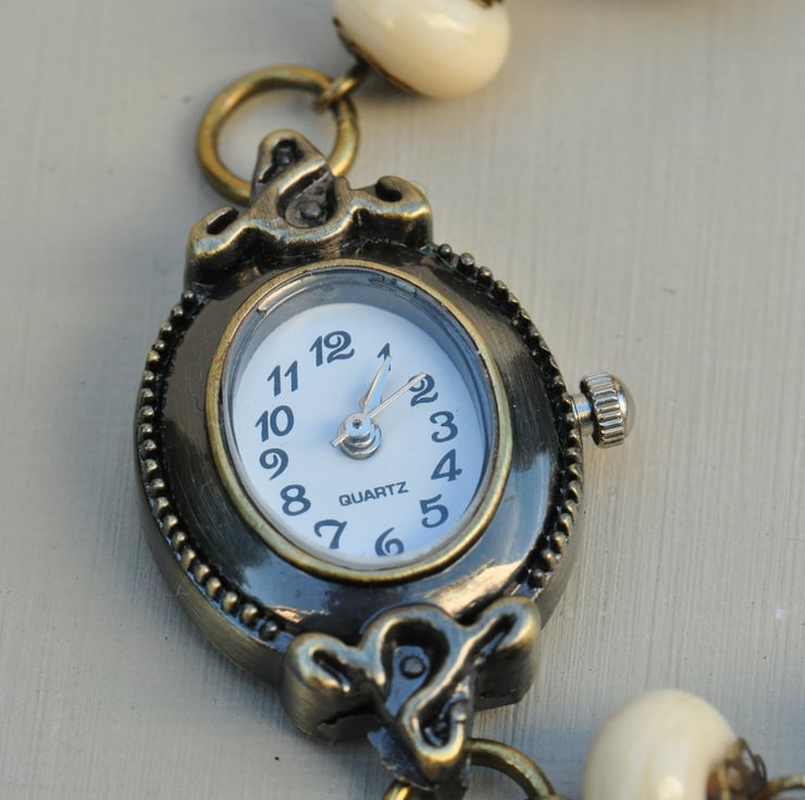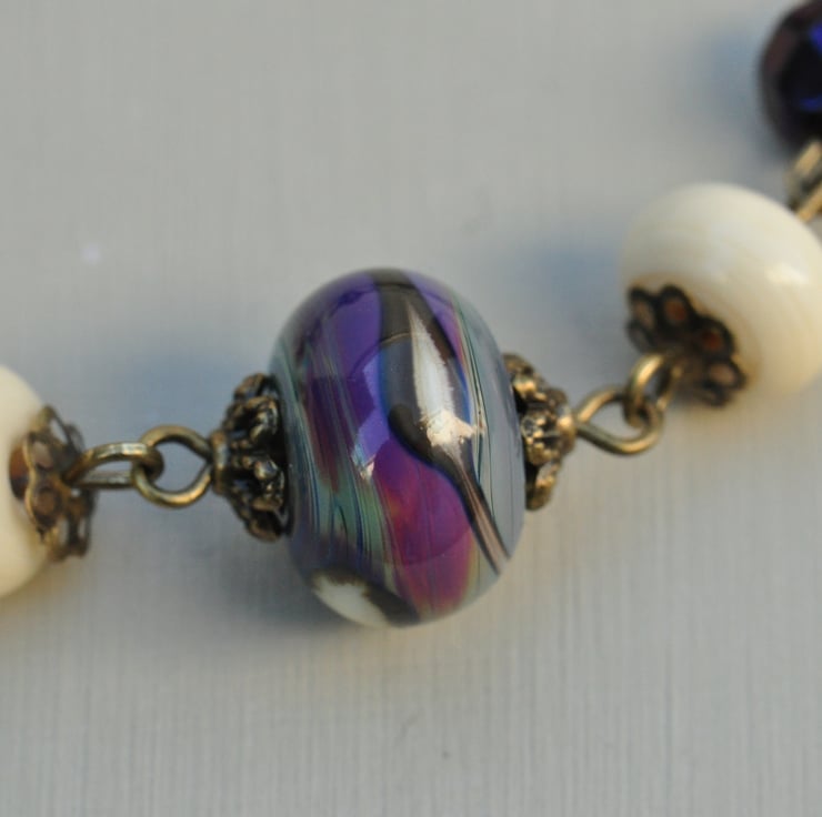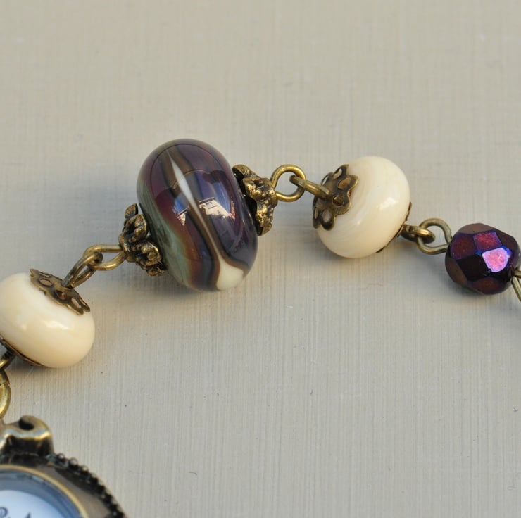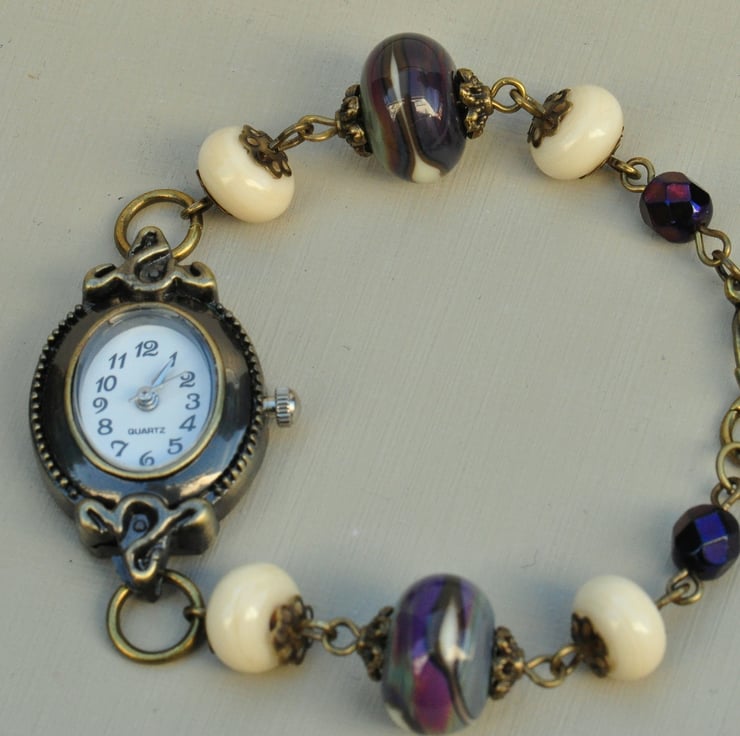 Beautiful oval antique bronze plated watch face with creamy Lampwork rondelle beads, stunning Lampwork focal beads which have swirls of deep purple, cream, blue and green throughout and Czech firepolished faceted purple iris beads which have a lovely iridescent look to them, finished with a trigger clasp.