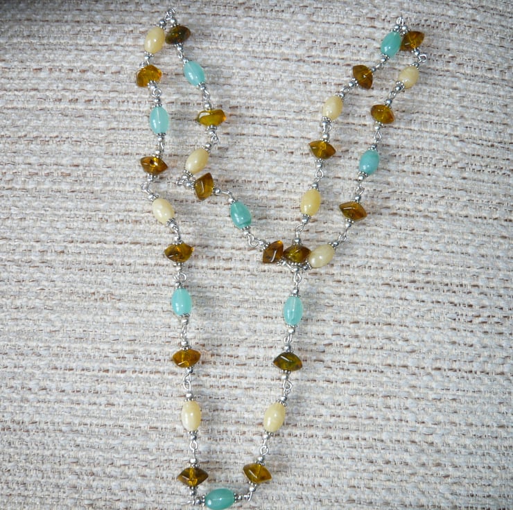 Fed up with fiddly clasps? This will just pop over you head! This is made up from three colours, amber,pale blue and cream acrylic beads all on individual links making up an appoximately 28" long necklace.
