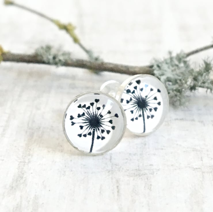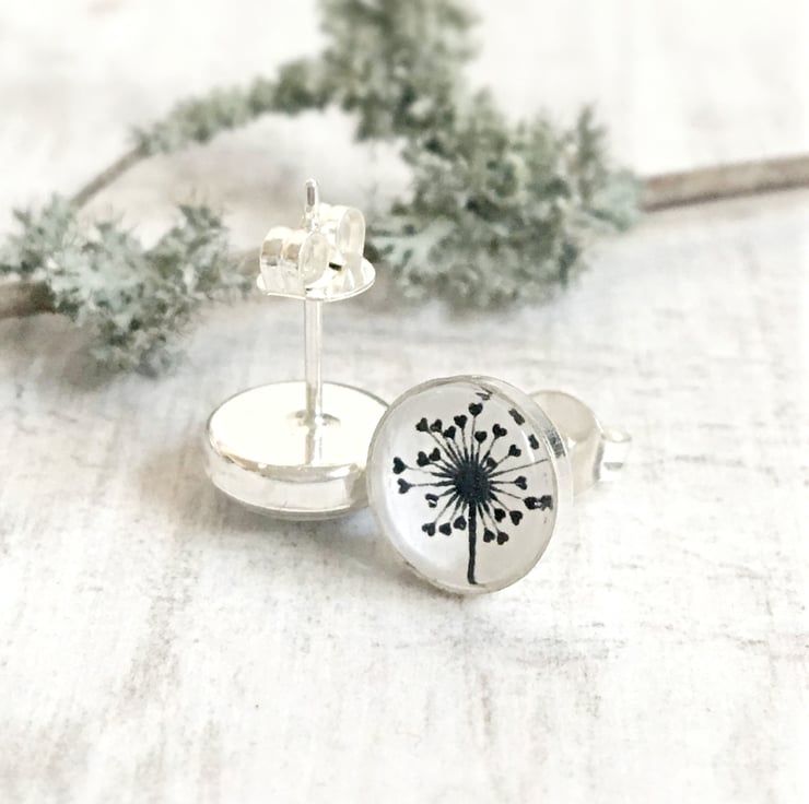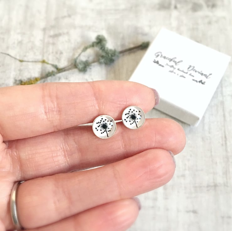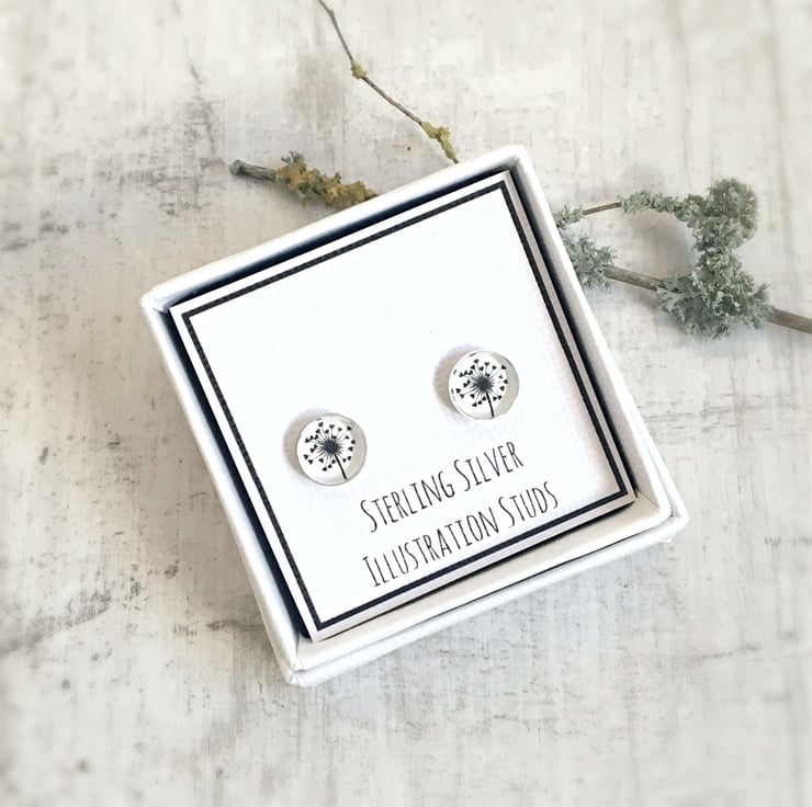 Little sterling silver round stud earrings that feature a print of my dandelion seed head illustration.