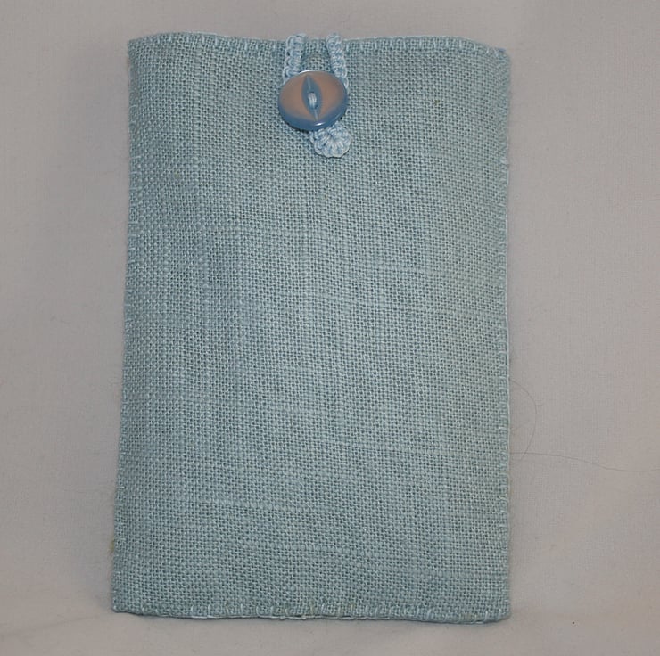 The case is lined in a printed cotton fabric - blue harebells on a white background, backed with iron-on interfacing. The reverse of the cover is a pale blue linen fabric. The case is seemed with blanket stitch in a pale blue crochet cotton for durability. The case closes with a crocheted loop - using the same blue cotton thread, over a blue button.