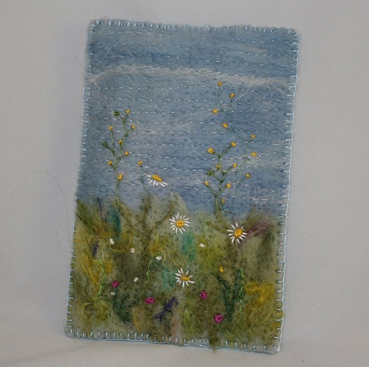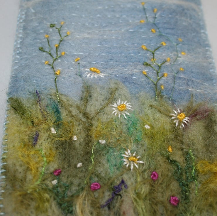Sky blue wool fibers have been felted to a background of kunin felt (produced from recycled plastic bottles. A wide variety of yarn snippets, carefully collected from other yarn projects, have been added to represent the meadow. Stitching in fine cotton has been added to the sky to 'stabilise' the felting. The case is edged in blanket stitch using threads to match the areas of the design. Simple embroidery stitches have been used to add distant daisies and buttercups. The daisies and clover in the foreground are stitched in more detail using more strands of embroidery thread to add perspective.