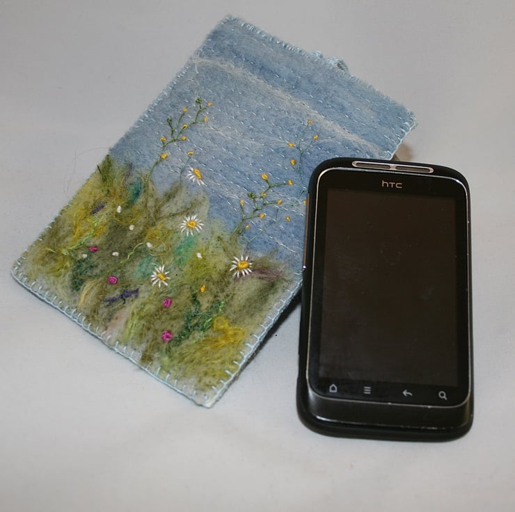 This phone case, or cosy,has been entirely hand-stitched from a lovely piece of 'meadow' felt, created from a variety of hand-dyed fibers, and hand-embroidered with a lovely sprinkling of meadow flowers.