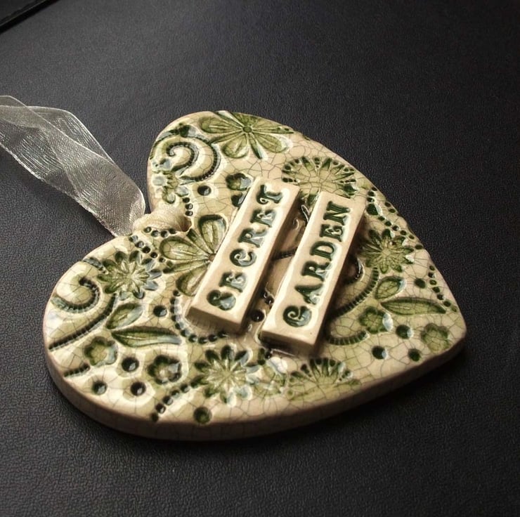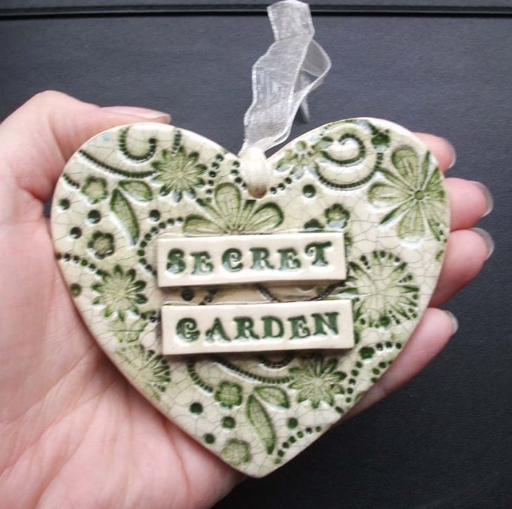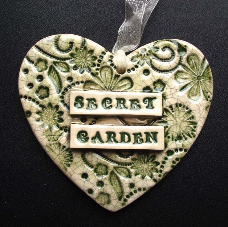 This ceramic heart is made from white earthenware clay and decorated with the words Secret Garden. It has a green leafy background finished off with a crackle glaze for a shabby chic look.