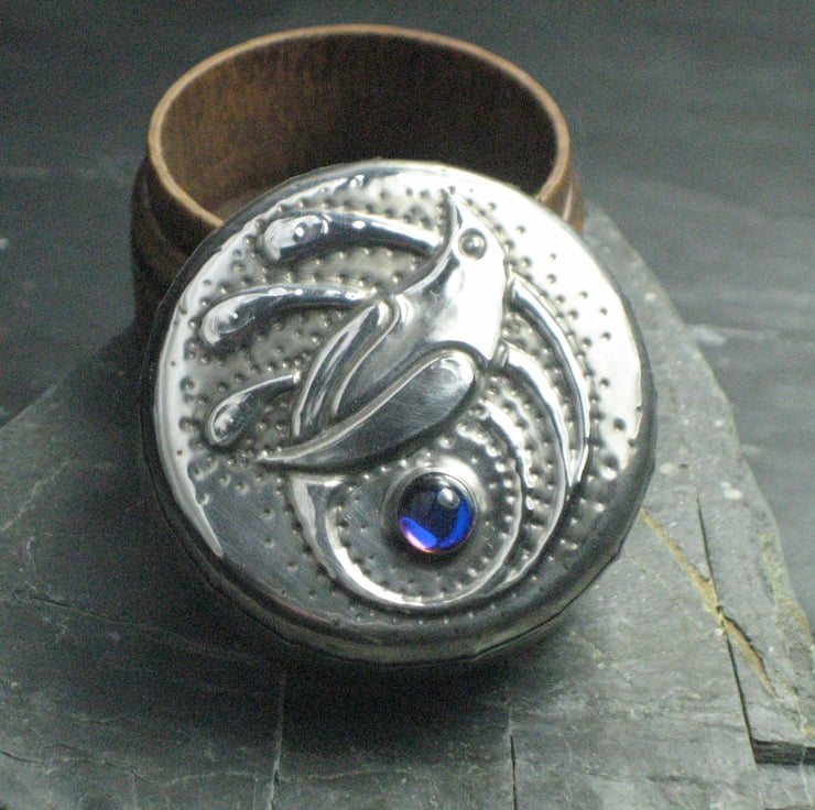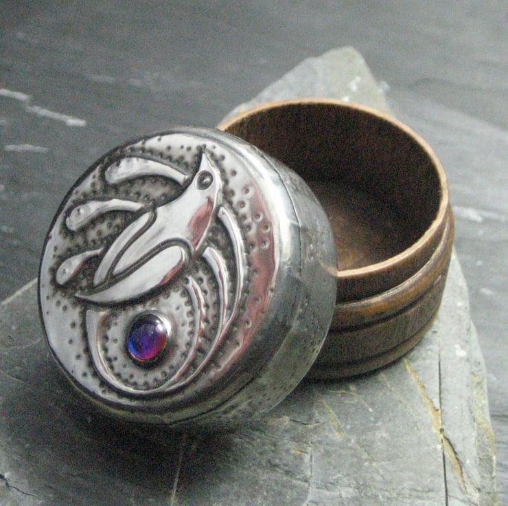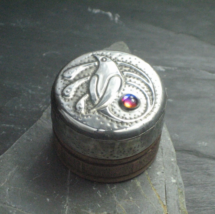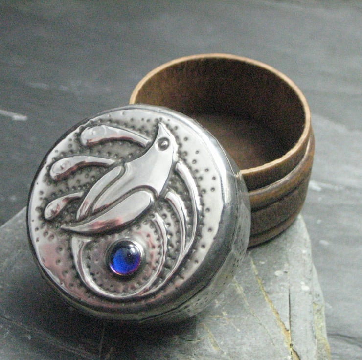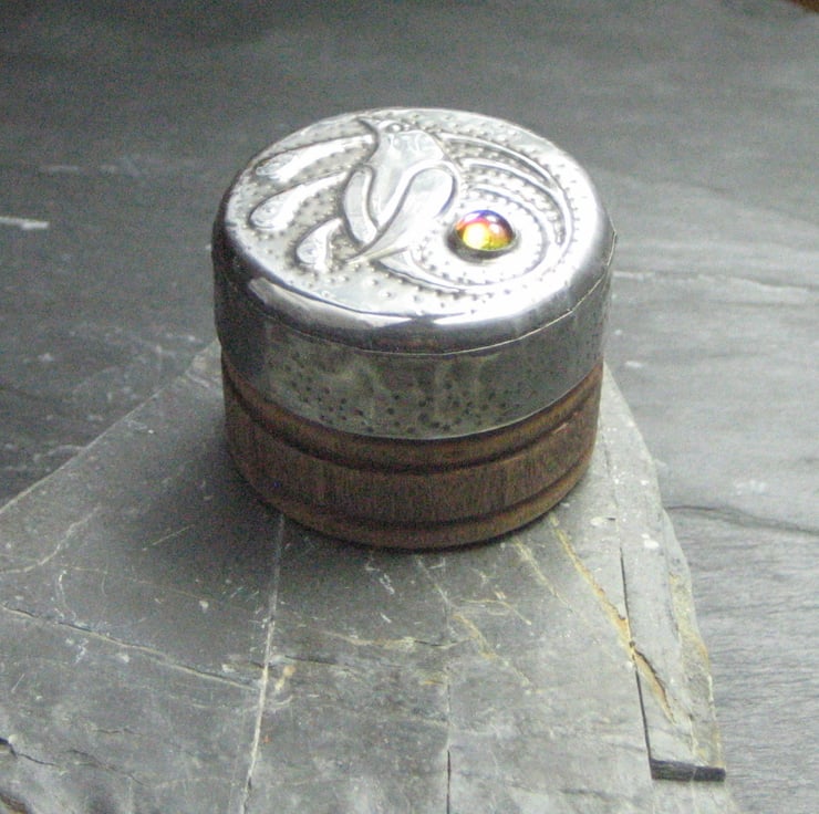 This little rustic wooden box has been transformed with a lid of hand-tooled pewter and features a lovely blue glass cabochon which changes colour with the angle of viewing. It is 26mm high and 36mm across. Perfect for tiny treasures. A great gift for a 10th Wedding Anniversary, Mothers' Day, Valentine's Day, Christmas or Birthday.