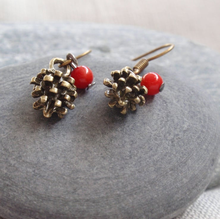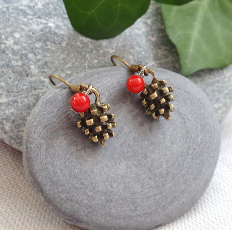 Pine cones embellished with a red coral bead . Bronze tone metal pine cone and hook