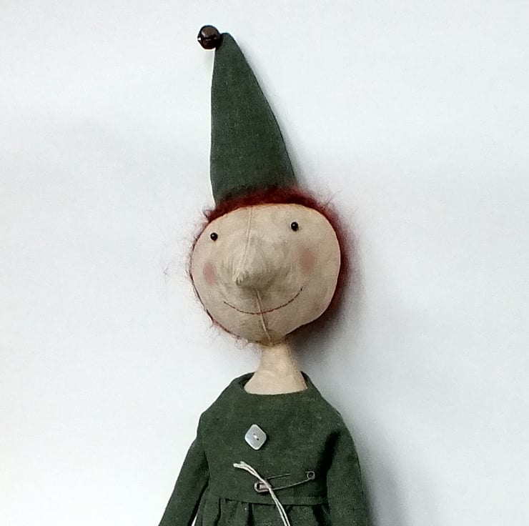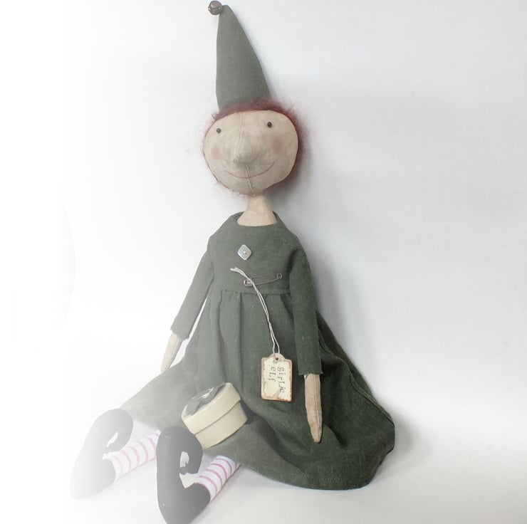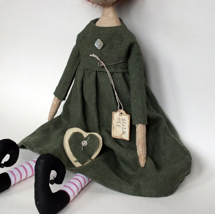 Girlie Elf is made from coffee and cinnamon dyed linen , sanded back for an aged appearance.Her hair is auburn mohair ,needle felted in place,her eyes little black glass beads and she has an embroidered mouth. The dress is an olive green linen with a vintage mother of pearl button,her stockings are pink and white linen and her boots are painted in black with little rusty bells on the tips.She holds on her lap, the very last Christmas present that she has made, which is contained in a little decorated papier mache box - I shan't tell you what's in it - it's a surprise !