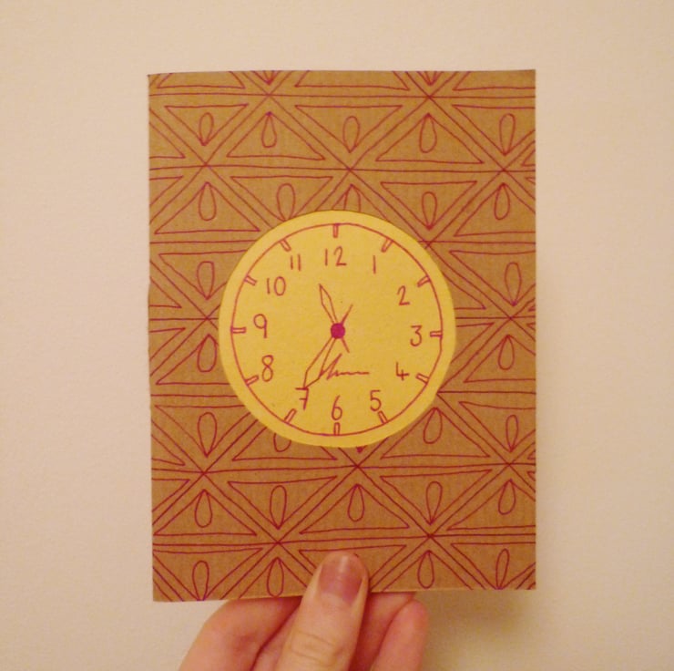 Notebook features a paper cut clock in the front cover and is lined with yellow. Each notebook is hand drawn as well as being bound by hand. The design wraps around the whole outside of the cover. They each have 40 sheets (back and front) of plain white paper inside.