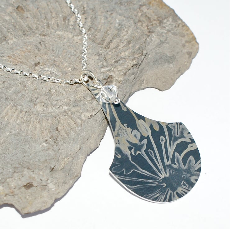A striking pendant made from hand printed and dyed aluminium that has been cut into a contemporary chandelier shape by hand. The pattern is modern floral and the necklace has a bicone bead detail. It is hung from a 16 inch sterling silver chain. Please note your necklace may vary very slightly from the one in the picture.