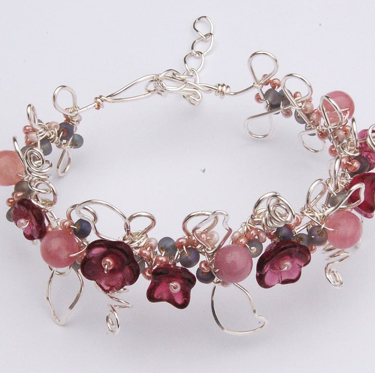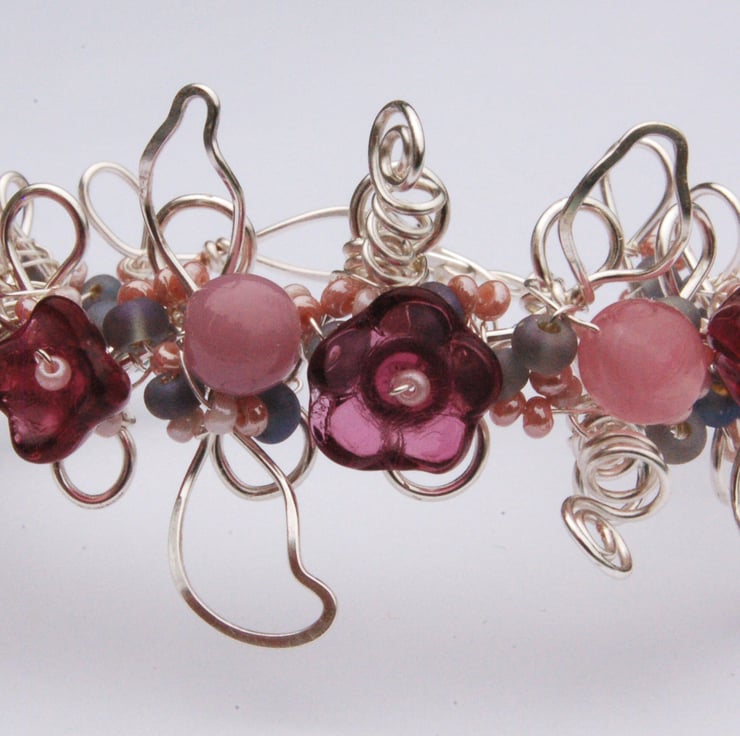 This bracelet is made from coiled and woven wire decorated with glass beads - flowers in a rich burgundy colour and round beads in shades of pink and mauve.