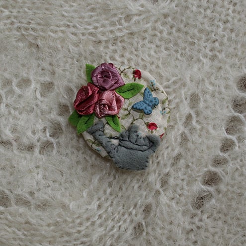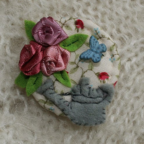 The scene is hand appliqueed and embroidered onto a cotton fabric background. The roses are formed out of ribbons carefully chosen to coordinate with the background fabric. The brooch is lghtly padded with a 'felted' wadding. The butterfly is a novelty button.