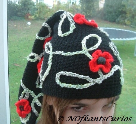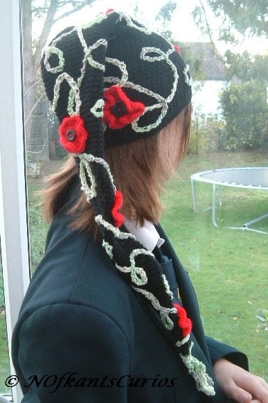 Poppy Trellis Elf child's long Crocheted Hat scarf with Crocheted looping tassel & poppy detail, to give it that little finishing touch! Approx 3 to 6 years of age.
