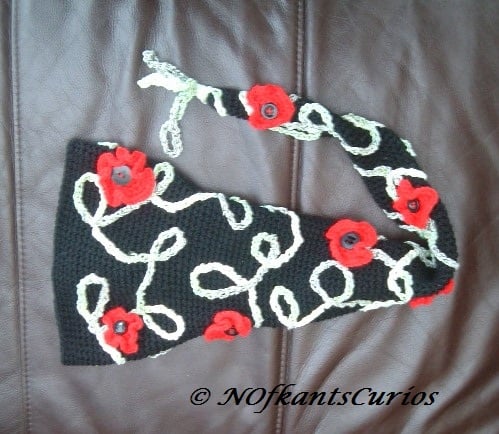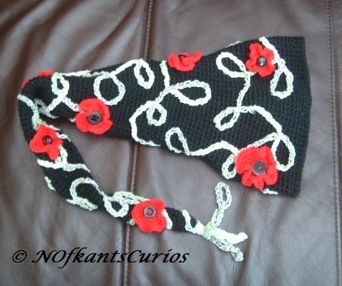 Crocheted in 100% Acrylic & mixed blend yarns, the main body of the hat is black, with a crocheted variegated green trellis & bright red poppies with black button centres, hand sewn to the scarf in a pretty design.