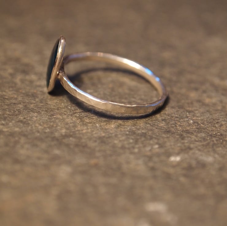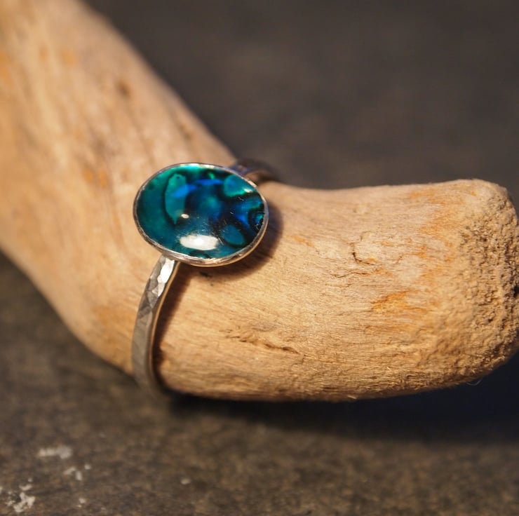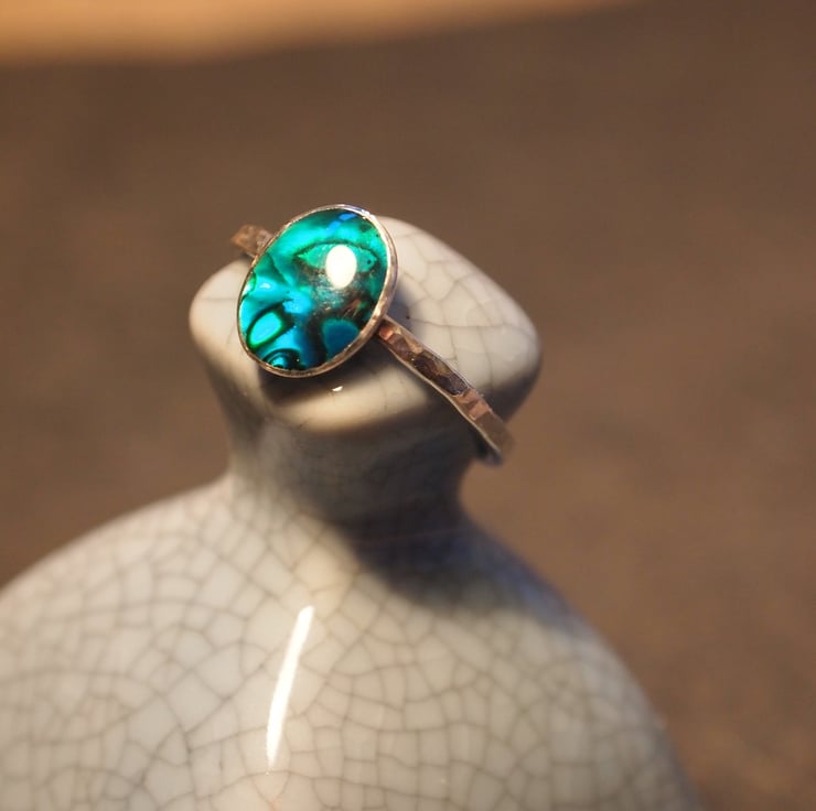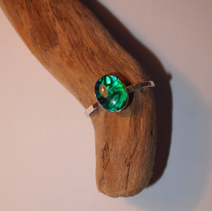 This ring has been hammered to add texture and sparkle. It is set with a green tinted paua shell cabochon. A lovely, dainty little everyday ring.