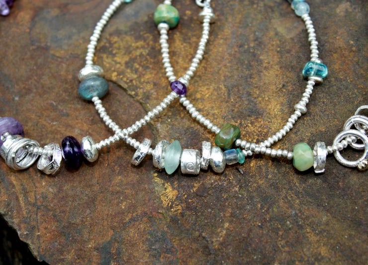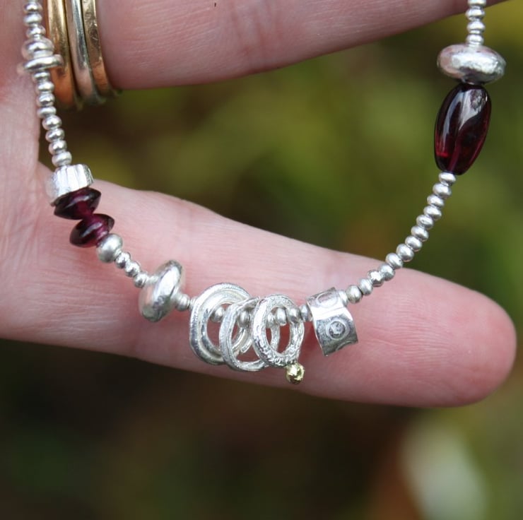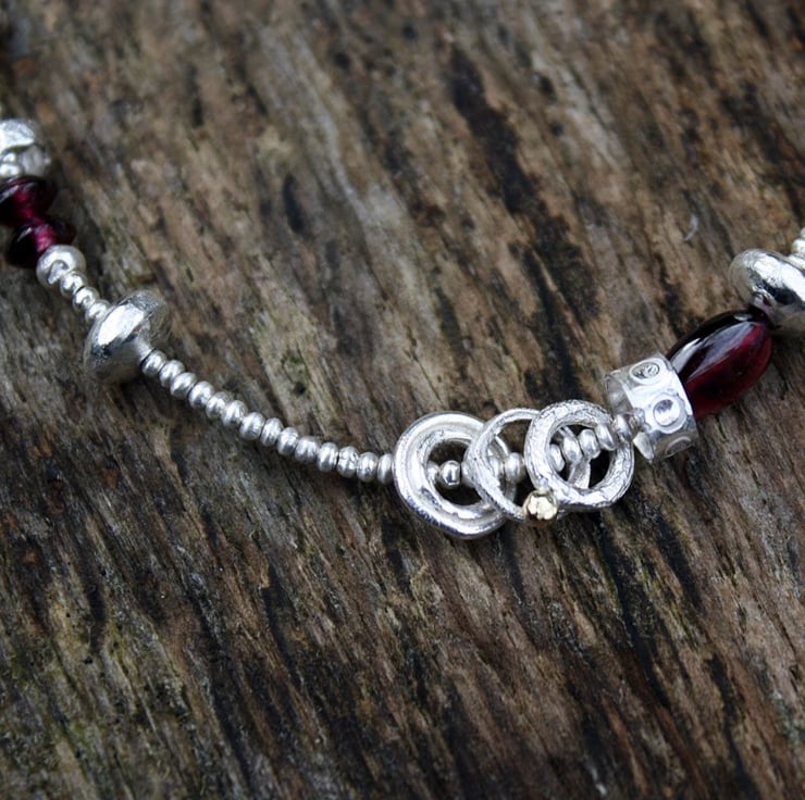 I have combined small 2mm solid silver beads with a selection of garnet beads and in the central section I have added 5 fused textured slider beads, one has an 18ct gold bobble .