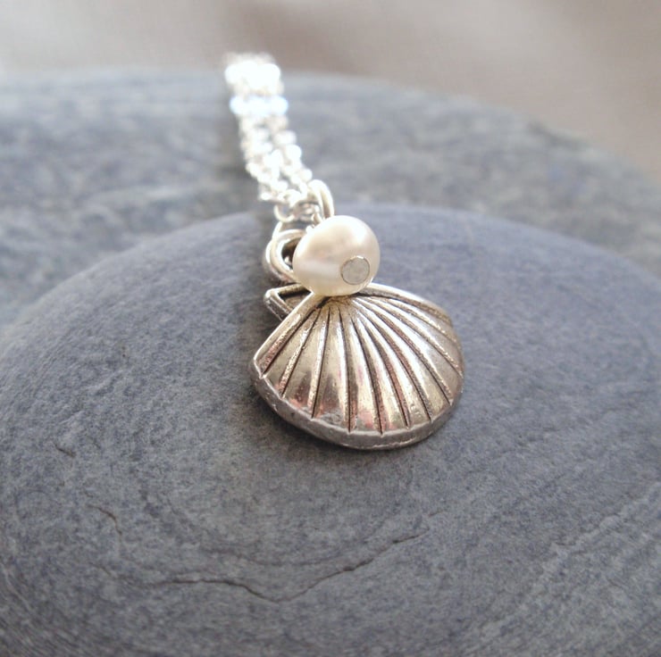 This is a dainty and elegant little sea shell charm pendant necklace with ivory white freshwater pearl dangling by it. It is approximately 1cm. It comes on an 18 inch silver plated chain, there are matching earrings in my shop. Please let me know if you prefer a different chain length.