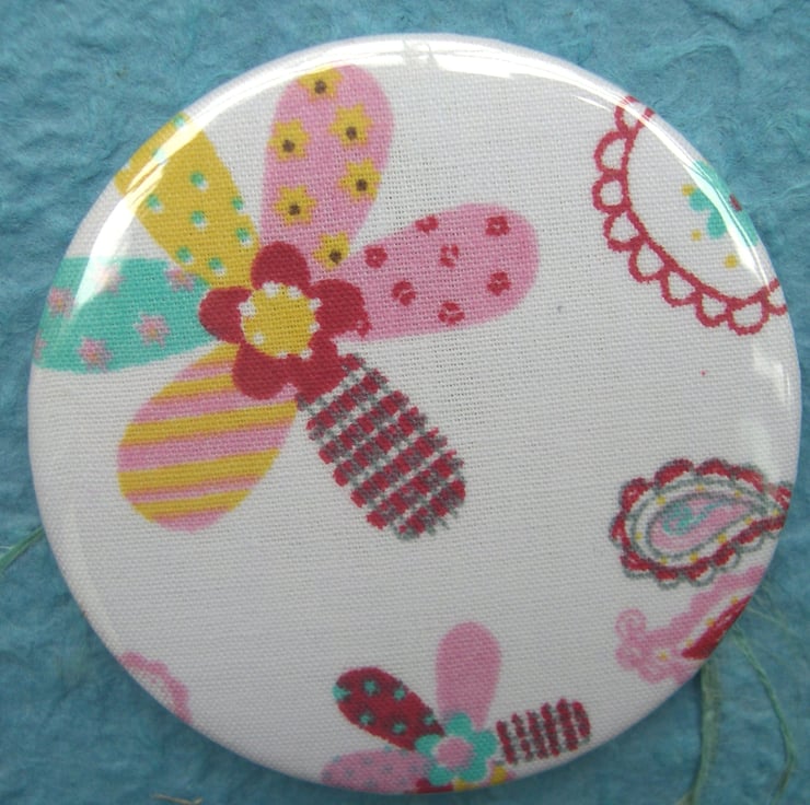 Recycled textile pocket mirror with a patchwork flower motif on a white ground- perfect for Mothers Day, birthdays or Valentines with its own love heart fleece pouch!