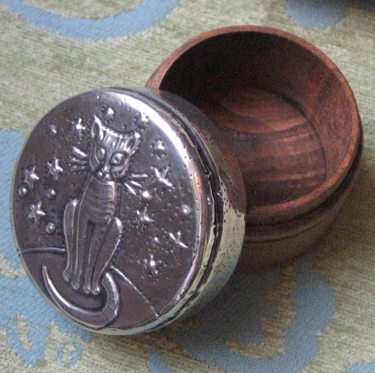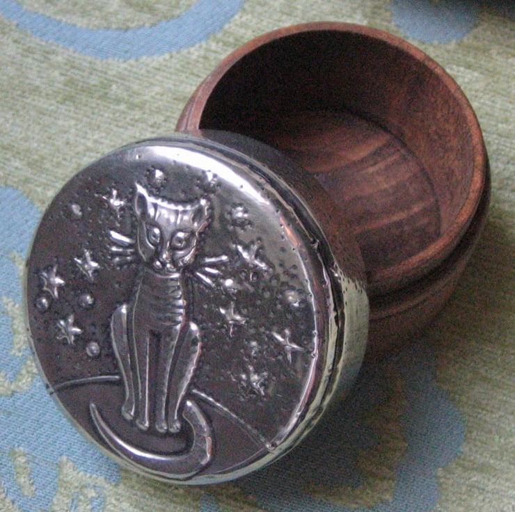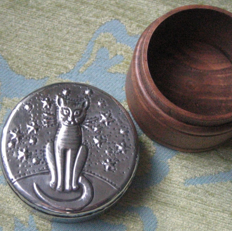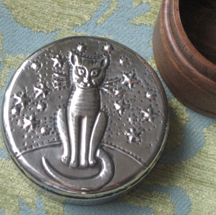 Handmade Silver Pewter Box, Magical Cat. This small wooden box has been transformed with a lid of pewter. It measures 44mm,1.75ins,in height and is 55mm,2.25ins, in diameter.The wood has been lightly tinted. A great gift for a 10th Wedding Anniversary, Mothers' Day, Father's Day, Valentine's Day or Birthday.