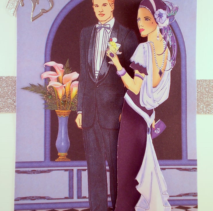 A decoupage 3D effect card for the sophisticated couple celebrating 25 years of marriage. Card is white measuring150x210mm (6x8in). I have used diecut shapes in blue and silver for the greeting and added a little silver gem. There is a a silver bow in the corner to match the silver glitter board. Insert is white with a heart decorative border and I have added a verse..