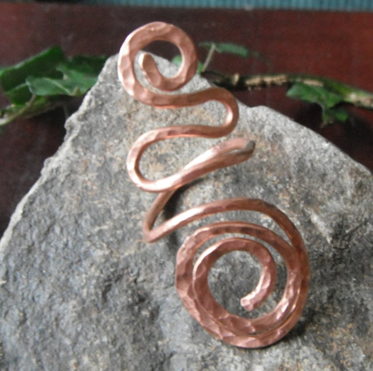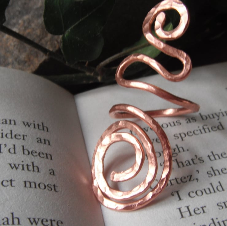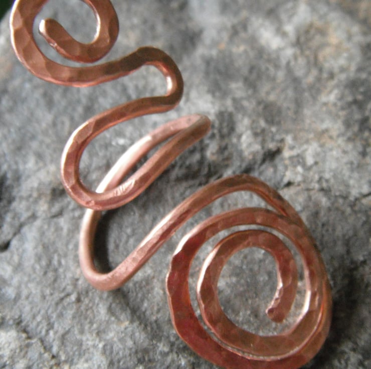 This wonderful ring is hand crafted from 2mm copper wire, twisted in a swirly serpent design, and hammered to give texture. Fits snugly on the finger between knuckle and knuckle, the large swirl on the top knuckle, the smaller swirl pointing down the finger.