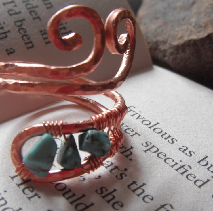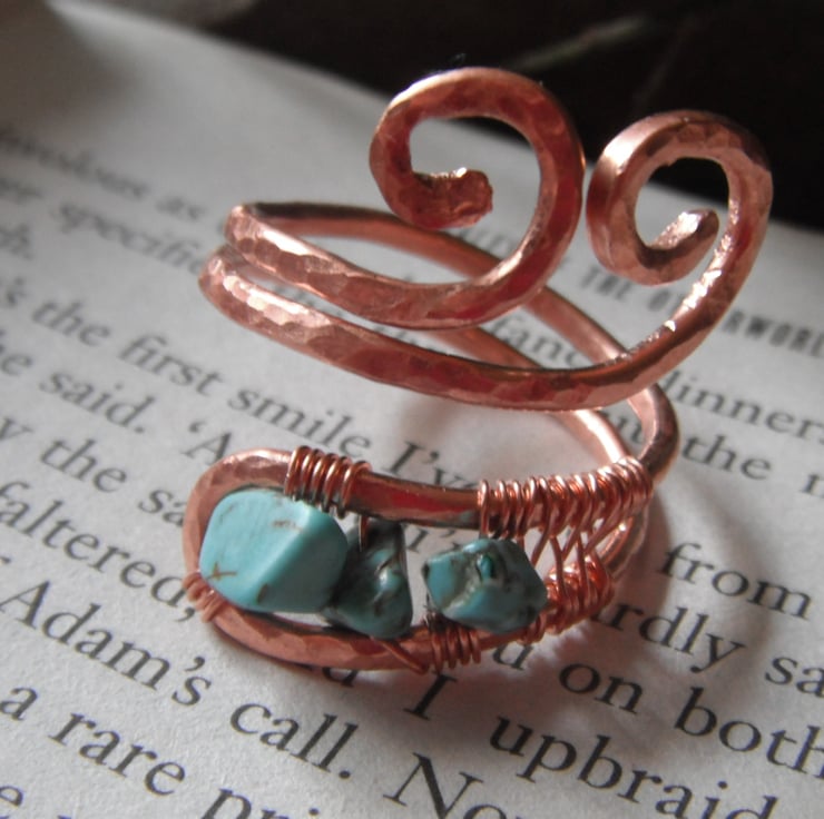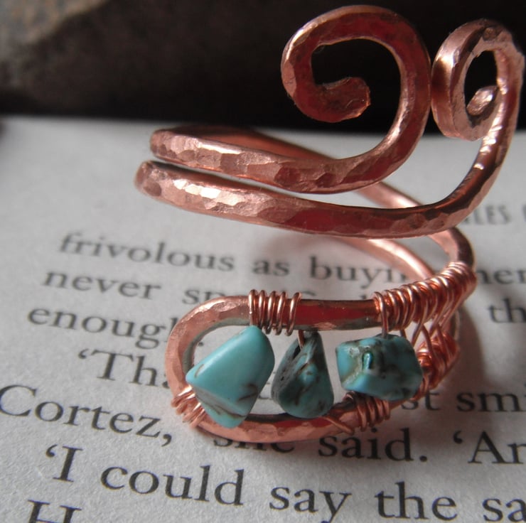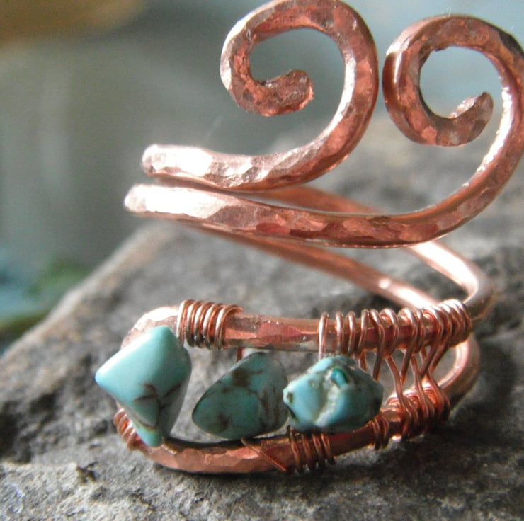 Twisted and hammered 2mm copper wire, wrapped with THREE turquoise chips. Unisex ring.