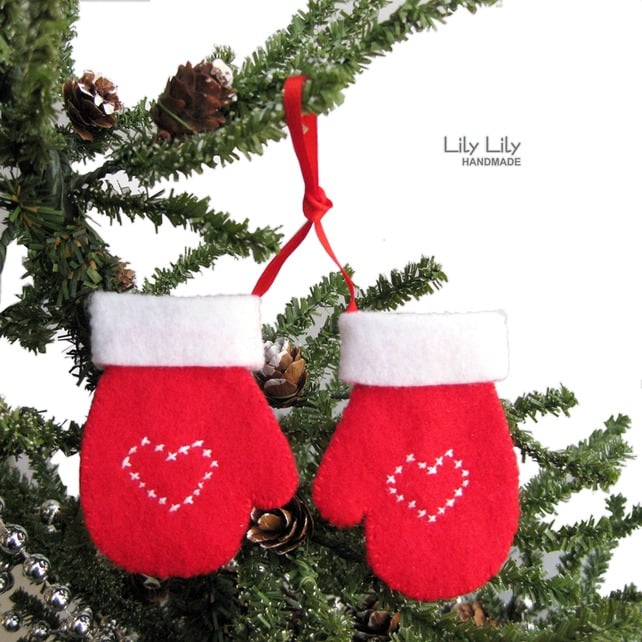 A cute pair of red mittens Christmas decorations, hand sewn in felt. Perfect for hanging on a Christmas tree and on door handles.