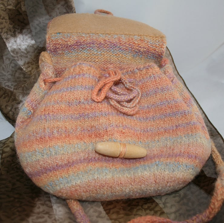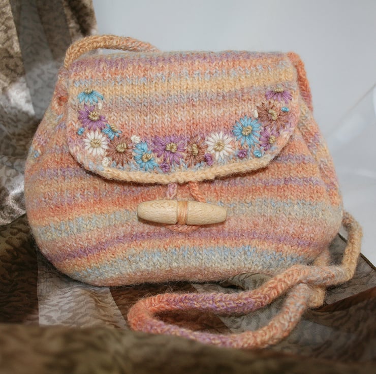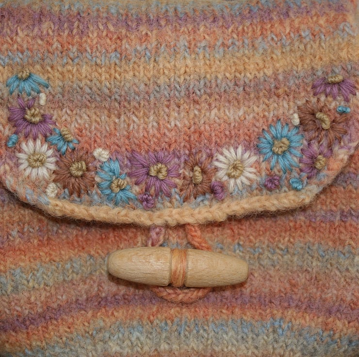 The body of the bag has been knitted in a pure wool yarn using needles in a smaller gauge than those recommended to produce a firm texture. A "pouch-shape" has been created by knitting darts into the bottom seem of the bag. The top edge is gently gathered in place by an adjustable cord, in the same yarn, which is tied in a bow. The strap is long enough to wear across the body and is formed from cord produced by working a crocheted chain of the yarn into a wider cord using a lucet. The bag, and all the cords, have been fulled or felted to produce a firmer texture. The bag closes with a lucet-produced cord over a vintage wooden toggle. The edge of the flap is decorated by hand-embroidered daisies in tapestry wools chosen form the shades of the bag.