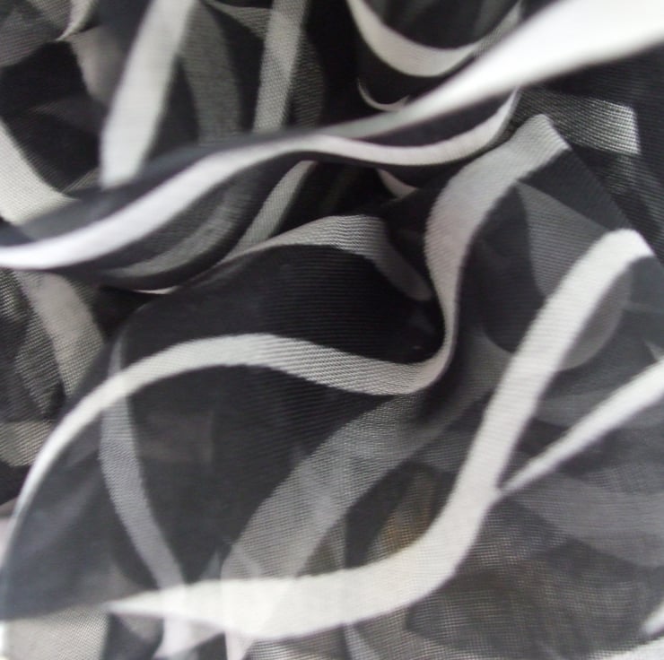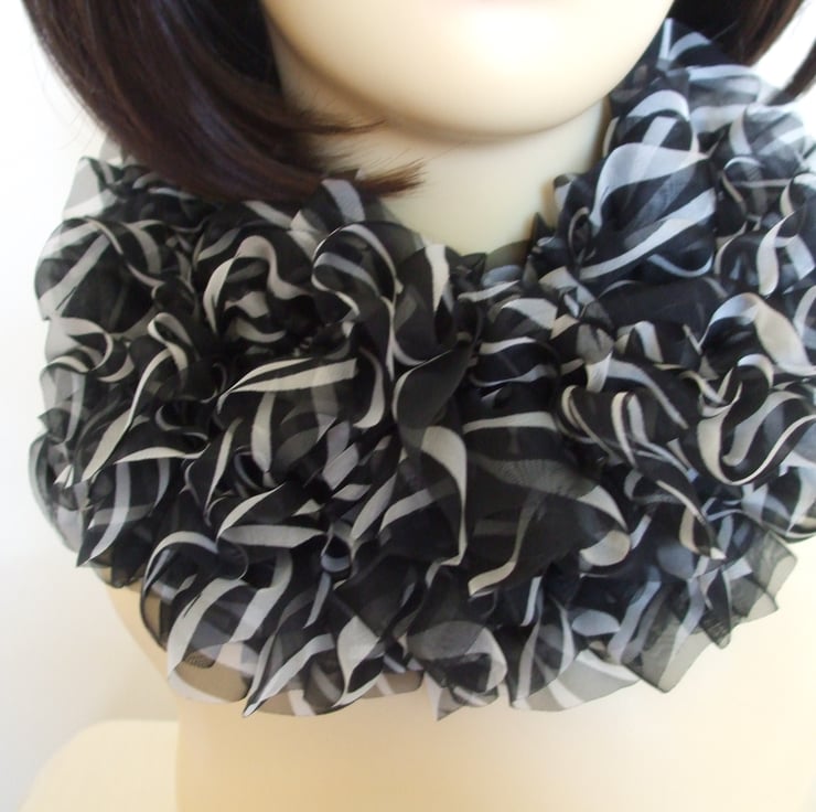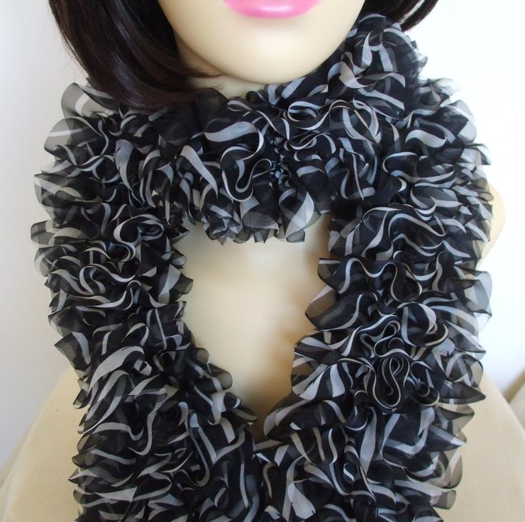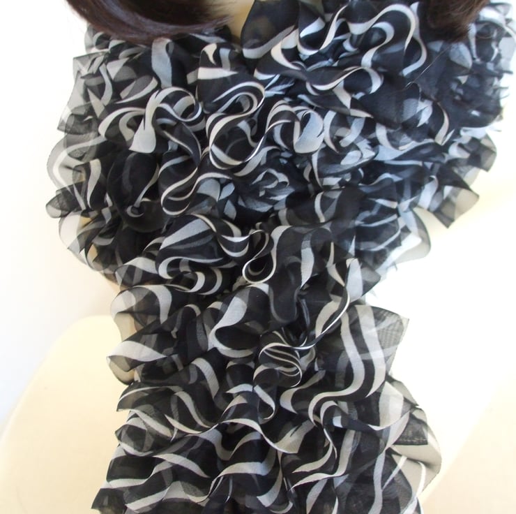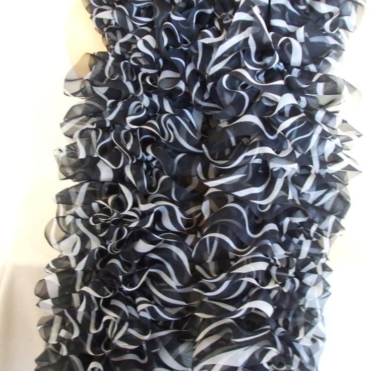 Beautiful scarf hand knitted in a totally different ribbon fabric which drops into a stunning cascade of frills. The ribbon is a lovely black and white zebra print