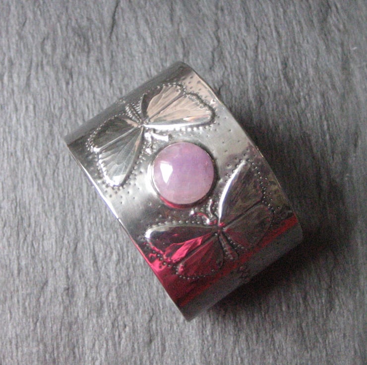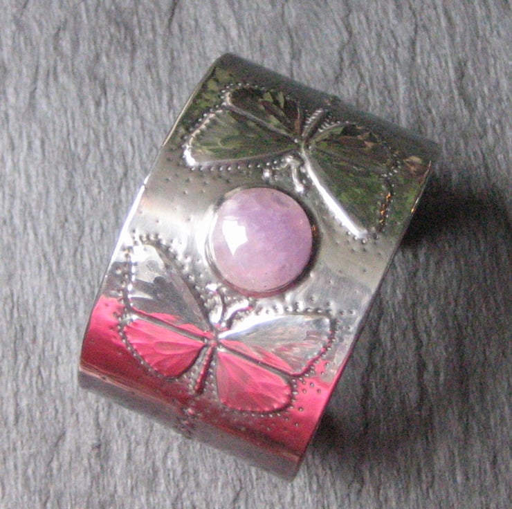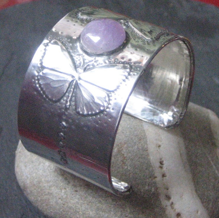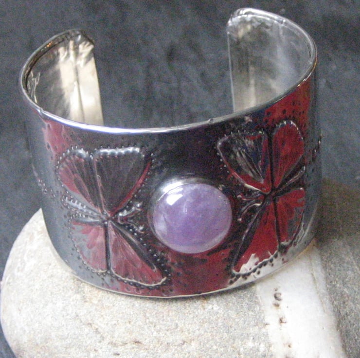 This stunning art nouveau style bracelet has been hand-made in shiny modern pewter, and features a lovely amethyst cabochon. The cuff is 38mm (1.5) deep,155mm (6.15) long. There is a space for putting the cuff on and off by sliding the hand in sideways.