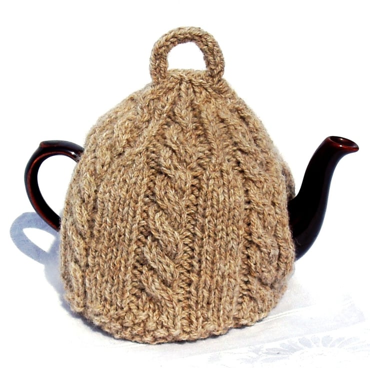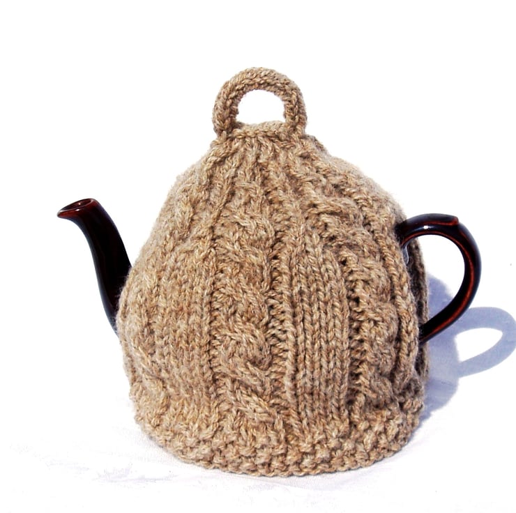 Knitted tea cosy in pale brown pure British wool.
