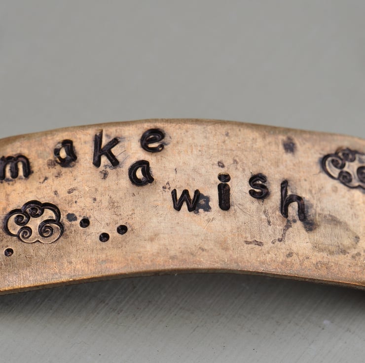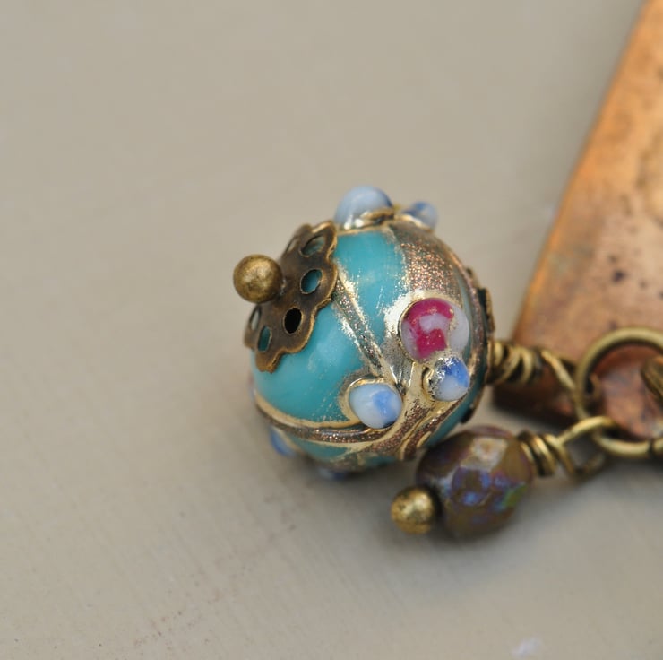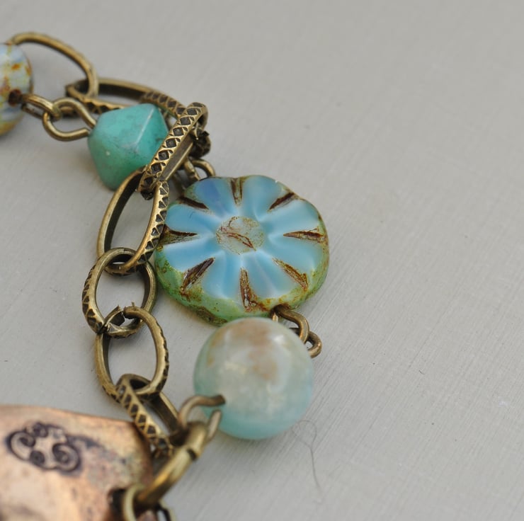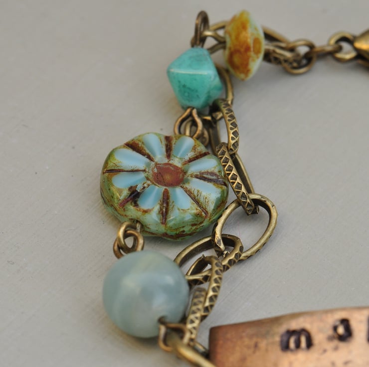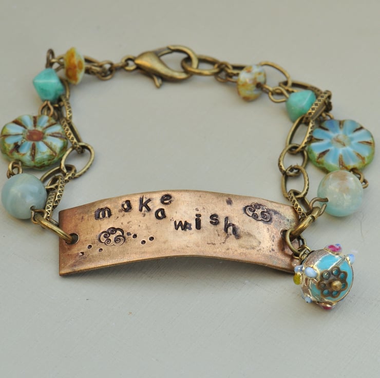 Vintaj brass blank on which I have handstamped the words "make a wish" and added little cloud motifs using metal stamps with a lovely Venetian glass bead and Czech picasso finish dangle at the front and one strand of antique bronze plated chain and one beaded with lovely Amazonite rounds, Czech picasso finish coin beads, Czech turquoise bicones and picasso finish rondelles, finished with a trigger clasp.