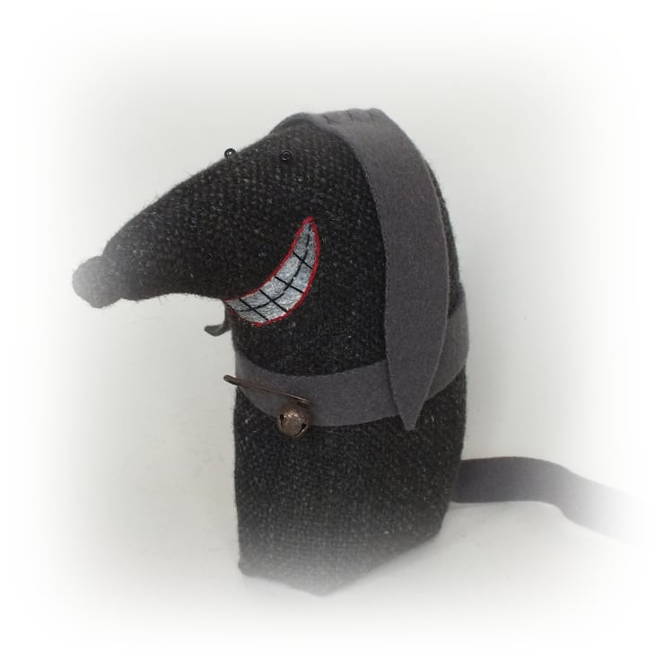 Smelly Dog is made from thick wool fabric with wool felt ears,collar and tail. His eyes are glass beads and his mouth has first been painted onto the fabric - I have then embroidered the lips and teeth. Smelly has his top half stuffed with poly and the base contains rice and lavender - to make him nice and smelly ! He is trimmed with a rusty bell and safety pin.
