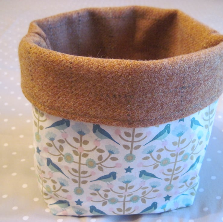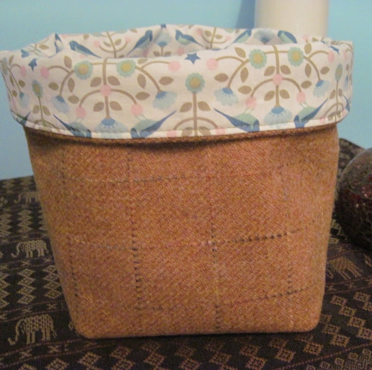 Made using 100% Harris Tweed fabric and a cotton blue bird print fabric this box is strong and durable but pretty at the same time. This box is reversible so take your pick which fabric you want on the outside!