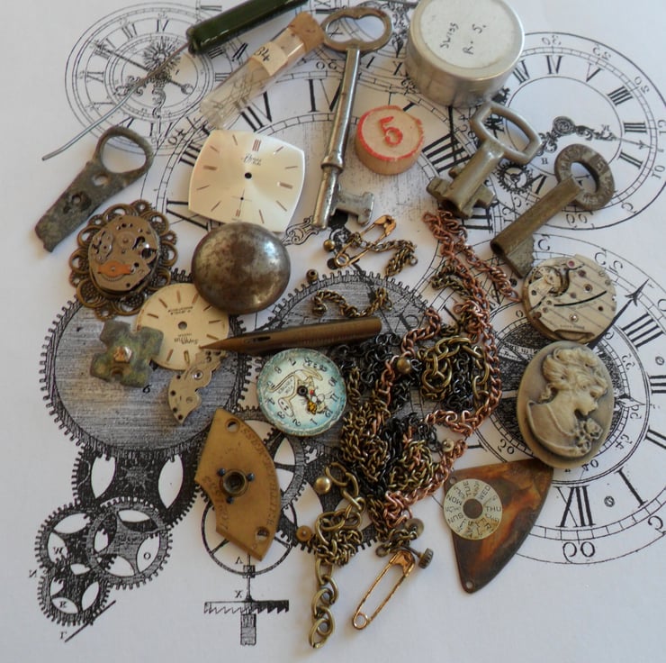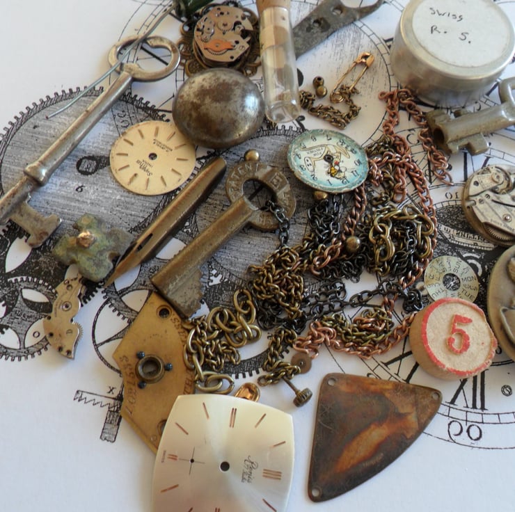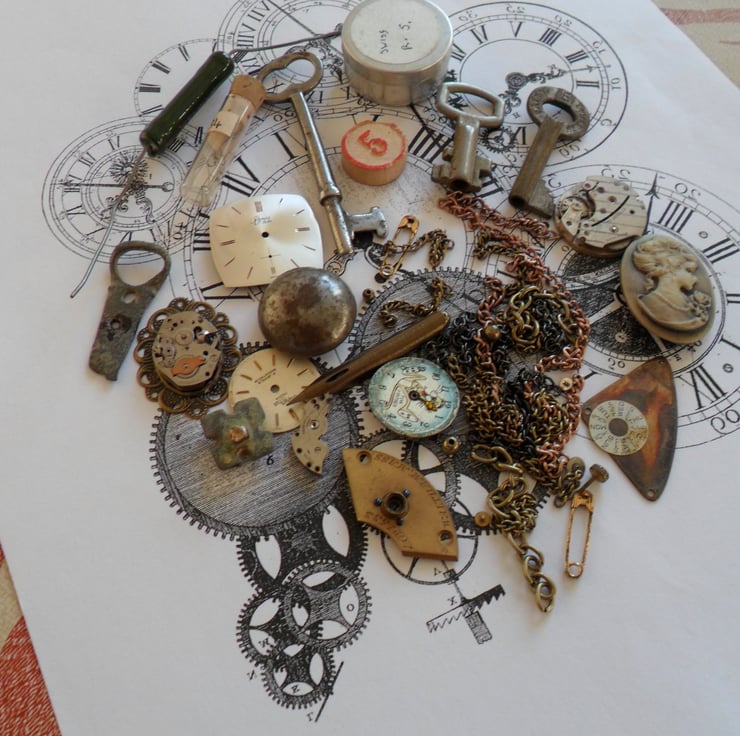 This inspiration Steampunk kit has wonderful vintage items I have collected over the years for all of your of Altered Art, scrapbook, steampunk projects.