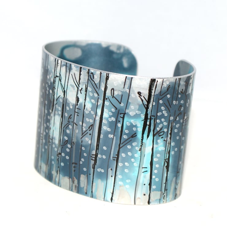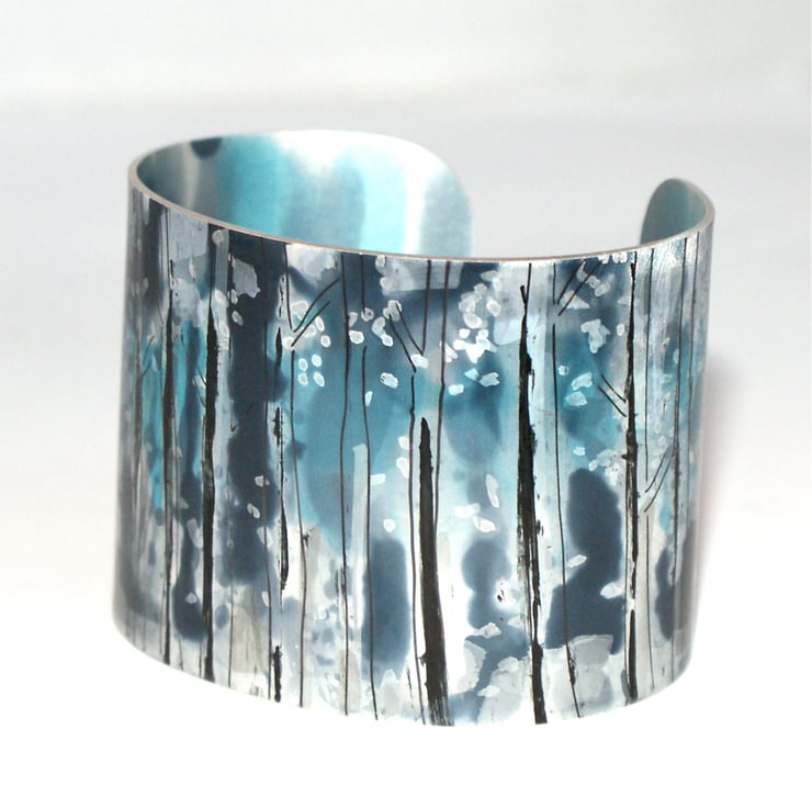 A hand painted cuff with an abstract woodland design dyed in blues and greys. Please note your cuff may vary slightly from the image.
