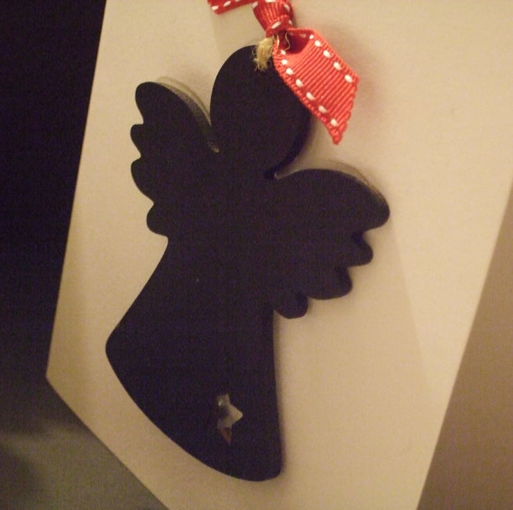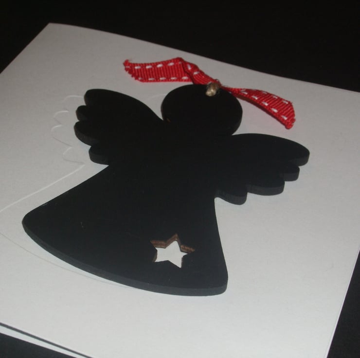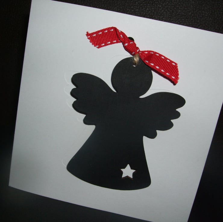 This is a card with a difference! The pretty wooden angel shape has been painted with chalkboard paint, tied on a string with a ribbon and attached to a card, so you can send it as a card and gift in one. The angel is easily removed from the card and hung on the tree and the angel shape has been embossed onto the card so it can still be put on display. If you wish, you can add a personal message on the angel in chalk, coloured pencils or permanent gold or silver pens.