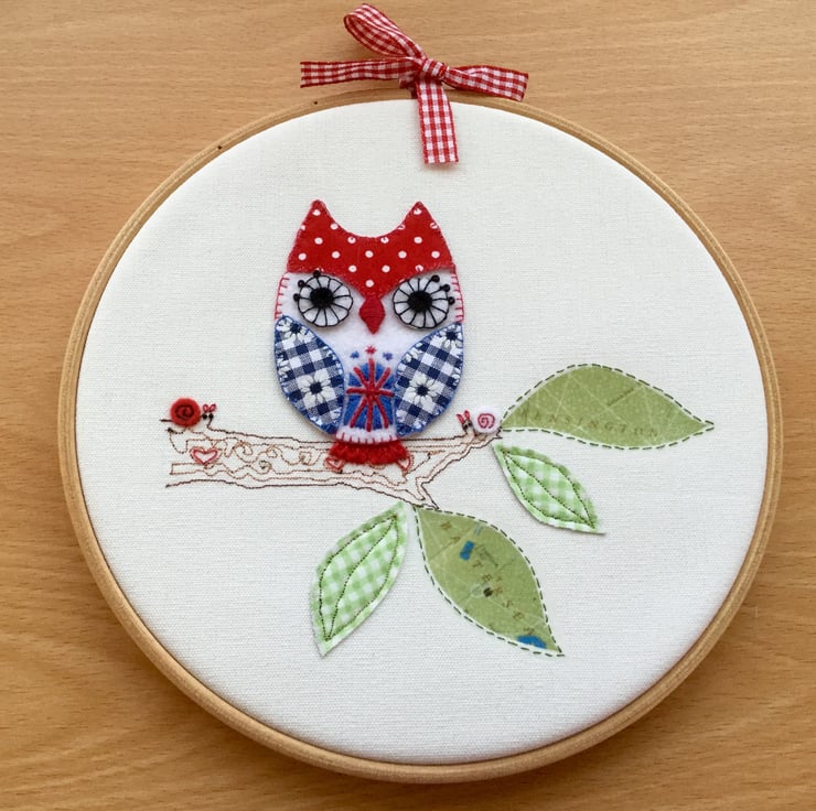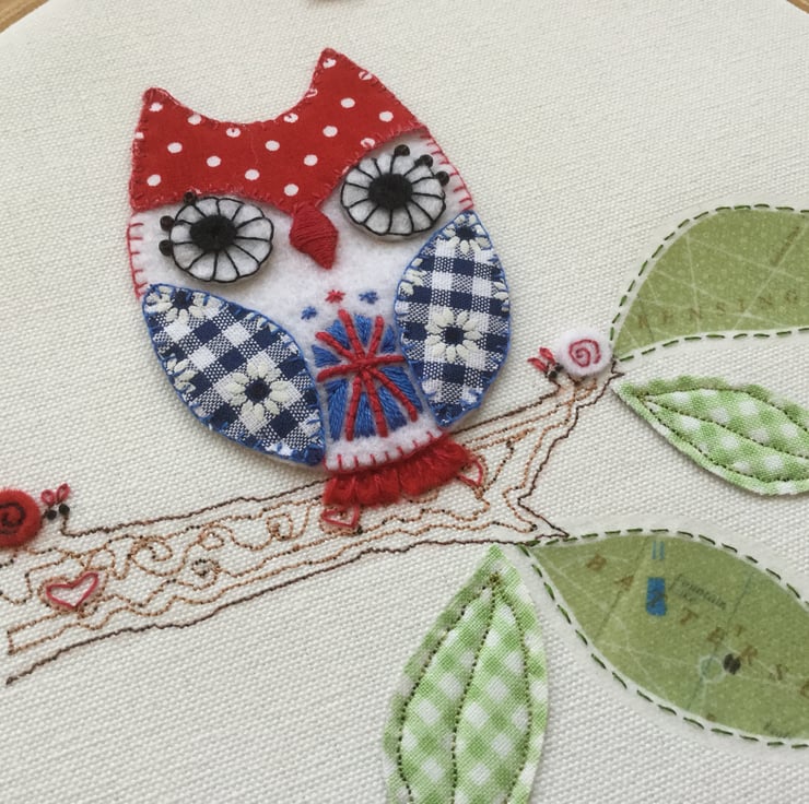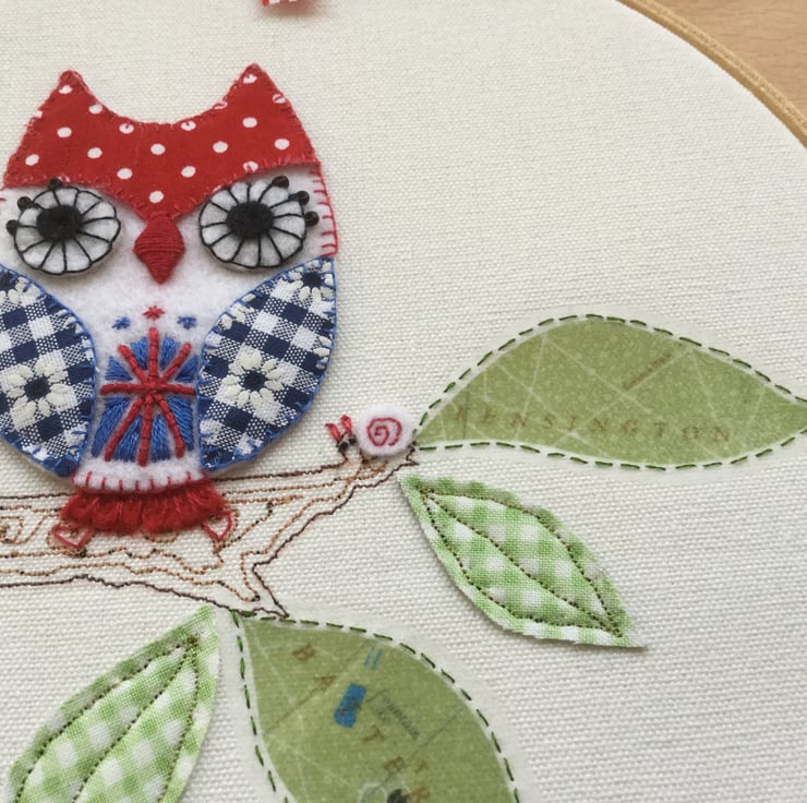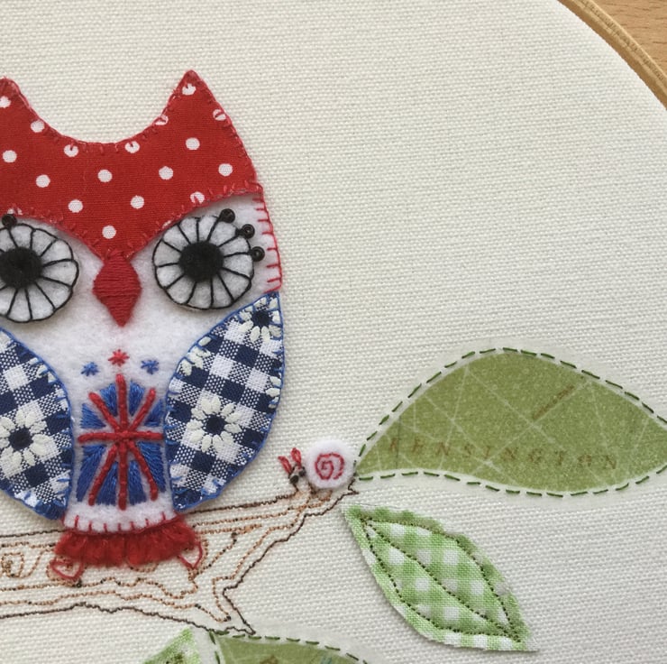 The owl has London Park map leaves on his branch and a cute pair of felt snails to keep him company. Details are picked out with blanket, satin and french knot stitches.