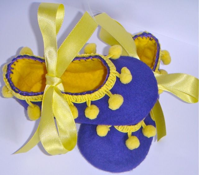 These are so sweet, they have purple felt uppers and soles, lined with yellow felt, and decorated with yellow pom pom trim on each shoe, all finished off with yellow ribbon ties. they are 9.5cm in length and 5.5cm wide, inside measurements.
